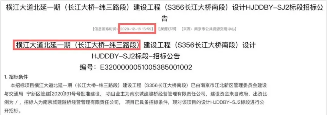 2020年底,官方正式发布横江大道北延一期建设工程招标公告。