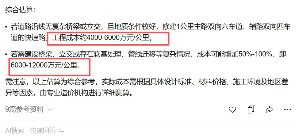 团团用问答工具搜索发现,1公里双向6车道快速路的造价成本为:
