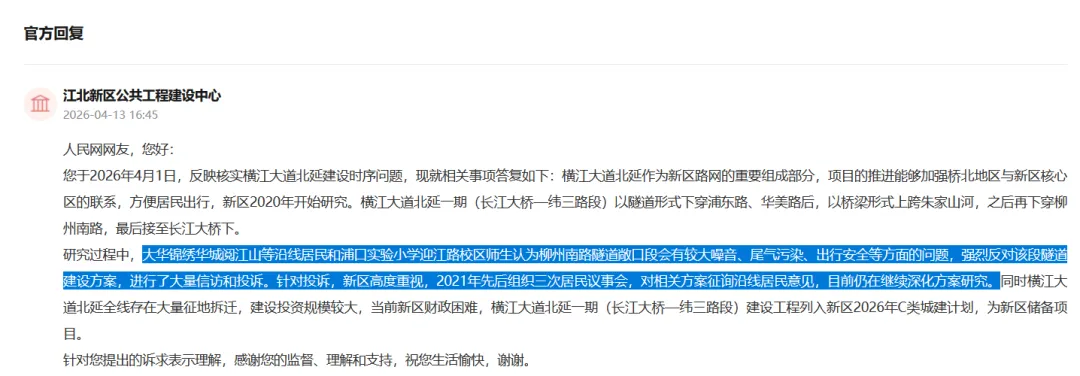 针对网友关心的横江大道为何迟迟没有进展,官方坦率表示:财政困难。