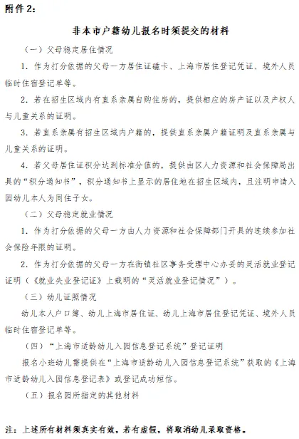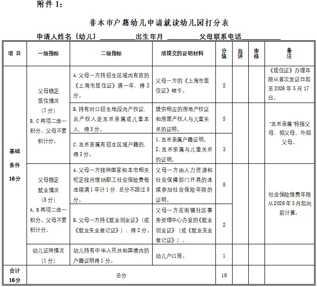 2.符合报名条件的非本市户籍适龄幼儿,按照《上海市居住证积分管理办法》,父母一方持本区居住证且积分达到标准分值的非本市户籍小班适龄幼儿,在全区范围内统筹安排入园。父母一方居住证积分未达到标准分值的非本市户籍小班适龄幼儿,按照“非本市户籍幼儿申请就读幼儿园打分表”(附件1)持证打分,视学额和打分情况依次逐步安排。父母一方技术职称证书或岗位证书、大专及以上学历证书(原则上须经相关部门官网验证视作有效)可在同等条件下作为奖励依据酌情考虑。外籍、港澳台幼儿参照执行。