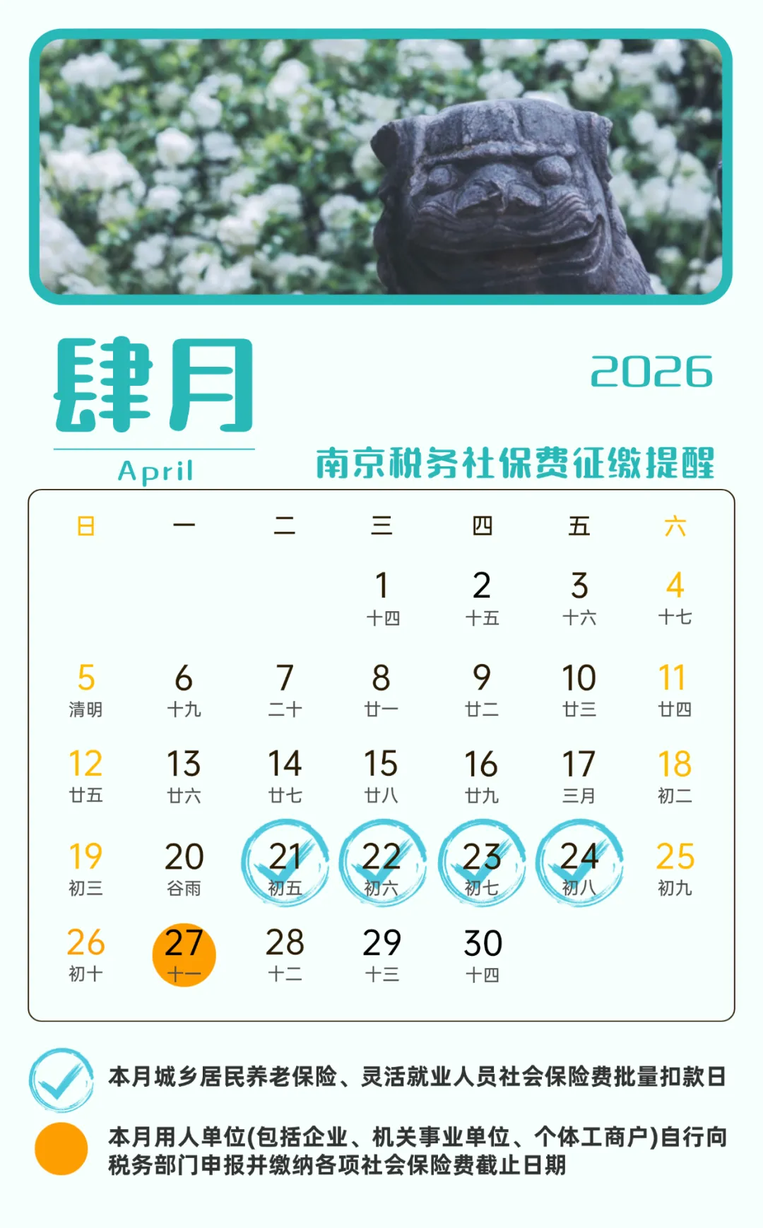 4月1日-4月27日,用人单位通过电子税务局、社会保险费管理客户端等渠道自行向税务部门申报并缴纳各项社会保险费。