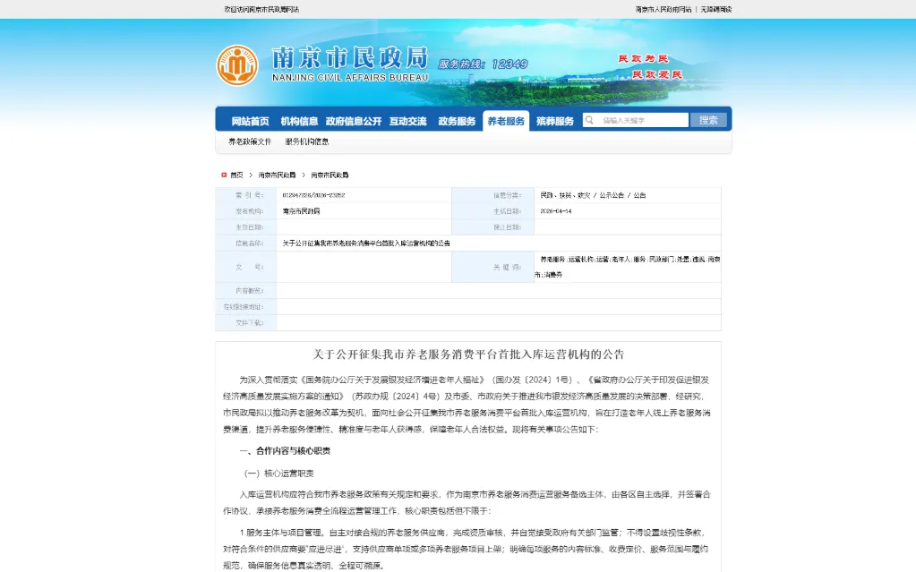 关于公开征集我市养老服务消费平台首批入库运营机构的公告为深入贯彻落实《国务院办公厅关于发展银发经济增进老年人福祉》(国办发〔2024〕1号)、《省政府办公厅关于印发促进银发经济高质量发展实施方案的通知》(苏政办规〔2024〕4号)及市委、市政府关于推进我市银发经济高质量发展的决策部署,经研究,市民政局拟以推动养老服务改革为契机,面向社会公开征集我市养老服务消费平台首批入库运营机构,旨在打造老年人线上养老服务消费渠道,提升养老服务便捷性、精准度与老年人获得感,保障老年人合法权益。现将有关事项公告如下: