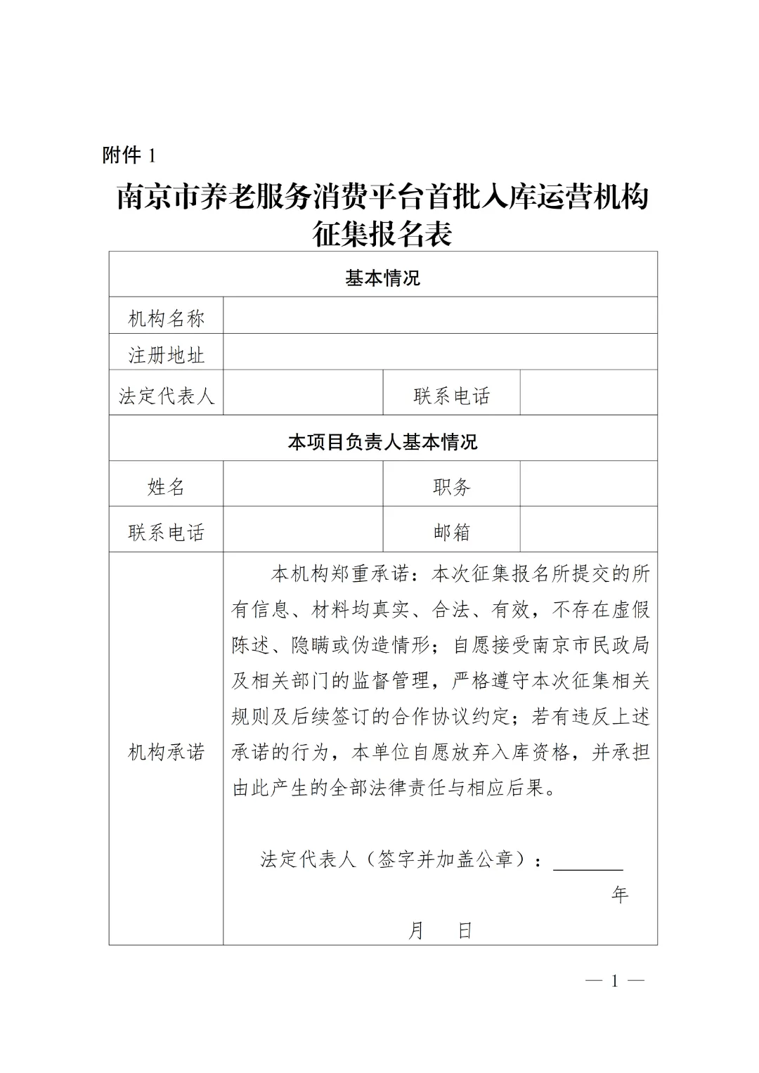 1.《南京市养老服务消费平台首批入库运营机构征集报名表》(见附件);