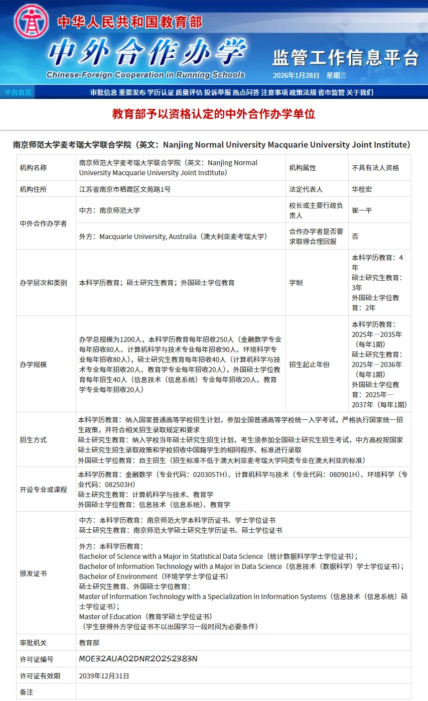 南京师范大学麦考瑞大学联合学院是南京师范大学与澳大利亚麦考瑞大学共同建设的中外合作办学机构,于2025年5月正式获得教育部批准。