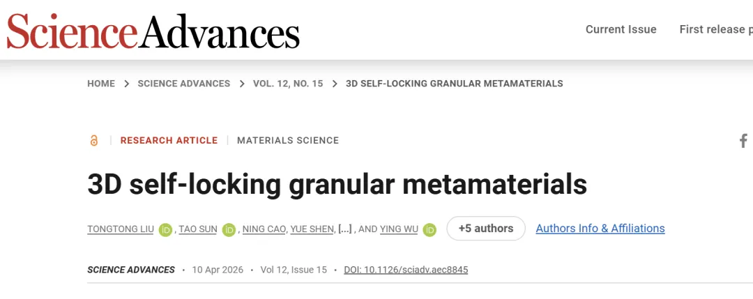 研究成果以题为:《3D self-locking granular metamaterials》发表于期刊《Science Advances》。单位为:南京理工大学、武汉科技大学,第一作者为:南京理工大学TongTong Liu.摘要: