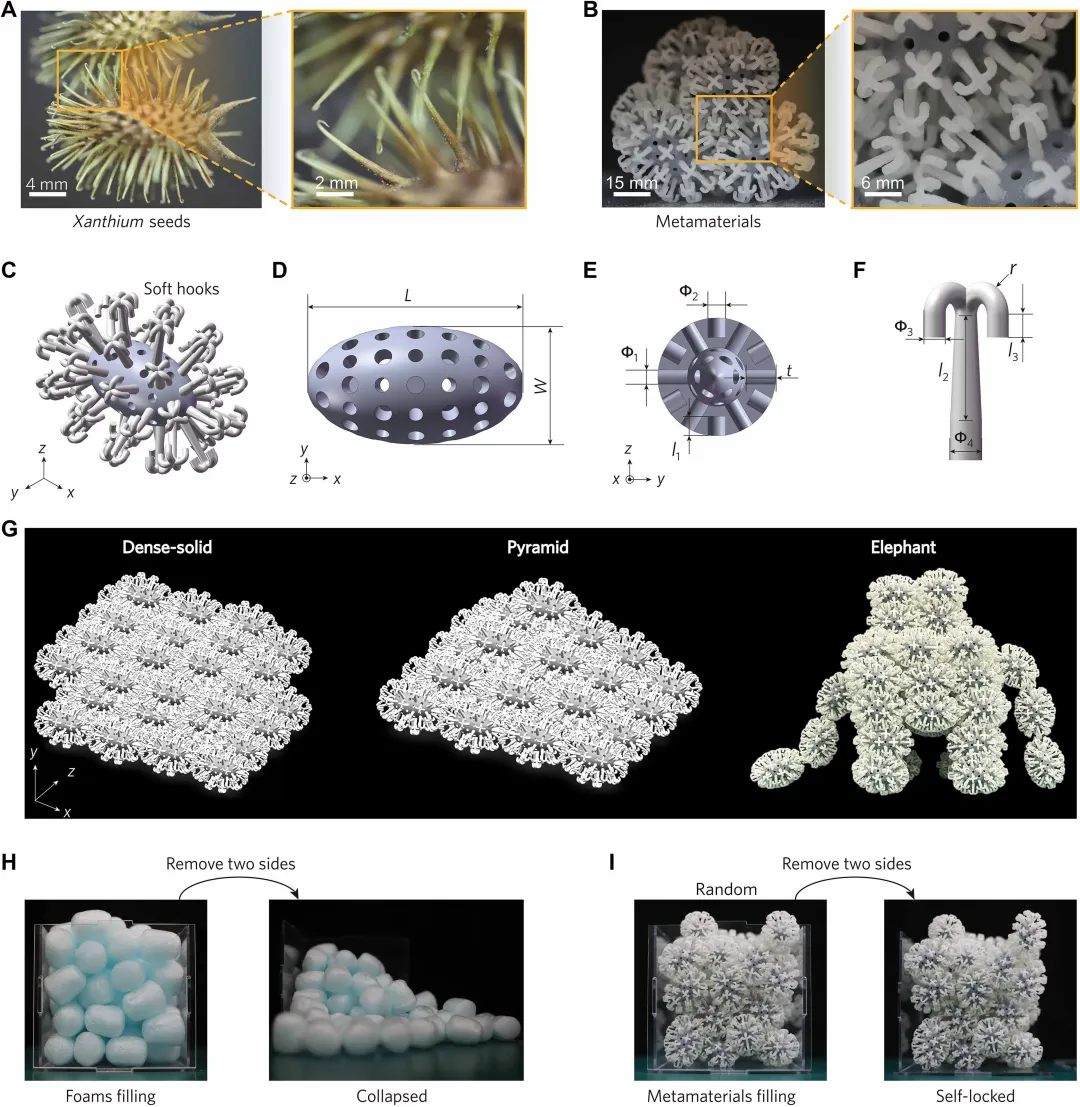 仿生设计:受苍耳种子通过柔性倒钩被动互锁的机制启发,设计了一种新型三维自锁颗粒超材料。