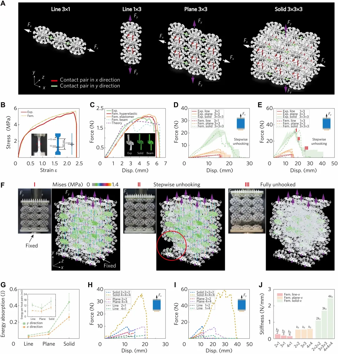 (A) 苍耳种子的自锁机制。(C) 单个自锁晶胞,由一个椭球体主体和均匀分布的钩状结构组成。(D-F) 晶胞的几何参数。对于椭球体,参数包括长轴 (L=29 mm)、短轴 (W=16 mm)、厚度 (t=4 mm)、通孔直径 (Φ₁=2 mm) 以及钩子插入孔的直径 (Φ₂=2.4 mm) 和深度 (l₁=2.7 mm);对于钩子,参数包括直径 (Φ₃=1.7 mm)、末端伸出长度 (l₃=1.7 mm)、弯曲段的轴向半径 (r=1.7 mm)、主体长度 (l₂=8 mm) 以及根部直径 (Φ₄=2.2 mm)。(G) 由颗粒超材料组装而成的各种结构,如密实固体、金字塔和大象。(H 和 I) 包装泡沫与自锁颗粒材料的对比。传统泡沫在放入四面封闭的盒子中时可以保护易碎物品;但一旦移除一面侧壁,泡沫就会移位并失去保护能力。相比之下,自锁颗粒材料由于自锁颗粒的互锁作用,即使没有包装盒也能保持其原始形状。(A) 沿 x 和 y 方向排列的线状、平面和立体结构的拉伸试样。(B) 实验和模拟拉伸试样的应力-应变曲线。左插图为实验图像,右插图为模拟模型图像及尺寸标注。(C) 理论、实验和模拟钩子测试(使用超弹性实体单元、弹性实体单元和梁单元)的应力-应变曲线。插图中从左到右分别为实验模型、实体单元模拟模型和梁单元模拟模型。(D 和 E) 分别沿 x 和 y 方向的实验拉伸力-位移曲线。实线代表平均值,阴影区域表示多个实验组观察到的标准差。虚线代表模拟值。插图为实验装置。(F) 立体-y 结构的准静态拉伸变形过程,对应于 (E) 中标记的 I、II、III 位置。色标显示 von Mises 应力值。(G) (D) 和 (E) 中各种结构的拉伸能量吸收。插图为线状、平面和立体结构中每个互锁钩对对应的能量吸收。(H 和 I) 分别沿 x 和 y 方向的拉伸模拟力-位移曲线。(A) 沿 x 和 y 方向排列的线状、平面和立体结构的剪切试样。F_s 表示剪切力。(B-D) 各种结构的实验和模拟剪切力-位移曲线。蓝色、红色、绿色和橙色区域分别表示接触零层、一层、两层和三层钩子的情况。(E) 线状、平面和立体结构沿 x 和 y 方向的剪切刚度随层间数量的变化。每个数据点的上下界代表三种结构对应的数值。(F 和 H) 分别具有两层和三层层间的 y 方向样品的实验曲线(此处取平均曲线)。灰色部分代表结构的类流体特性。(G) 线-y 两层间结构在不同剪切位移下的实验和模拟结果。上方面板显示钩子之间的初始间隙(蓝色和绿色标记)。中间面板捕捉到所有钩子啮合的完全锁定状态。底部面板显示钩子完全分离后的断裂线状结构。色标显示 von Mises 应力值。(J) 线-y 两层间结构中零个、一个、三个和六个钩对对应的 von Mises 应力,分别对应位移为 25.7、26.1、29.3 和 32 mm。(A、C、E) 分别为密实固体、金字塔和 Random 125 结构的应力-应变曲线。黑色圆圈表示致密化应变的位置。实线和虚线分别代表实验和模拟结果。插图示出了加载条件。F_N 和 F_{x,y,z} 分别表示单轴和多轴加载下的压缩力。(B、D、F) 密实固体、金字塔和 Random 125 结构在不同应变下的实验(上方面板)和模拟(下方面板)变形图。(G) 五种结构在压缩过程中的实测 EAU(单位体积能量吸收)和能量吸收效率。(H) Random 125 结构在不同压缩应变下的循环加载应力-应变曲线。箭头表示加载次数。黑色方块表示每次循环的残余应变。插图示出了初始和压缩后的结构。(I) Random 125 结构的可重用性。蓝色线表示第 100 次压缩。橙色曲线显示了 100 次压缩循环的平均性能。(A) 冲击实验示意图。红色标记表示两个加速度传感器。平台边长为 a = 0.5 m,钢球下落高度为 h = 0.5 m。(B) Random 125 和传统泡沫在两种约束条件下的示意图。上方:Random 125 自锁颗粒。下方:泡沫材料。左列:材料限制在四面容器中。右列:材料放置在三面容器中。(C) 在质量为 0.4 kg 的钢球冲击下,各种结构测得的平台加速度。160 ms 和 400 ms 时刻的快照由高速摄像机捕捉。(E 和 F) 钢球加速度和平台动能随冲击次数的变化。(G) 分别经过 80 次和 120 次冲击后,受损和未受损的泡沫及颗粒超材料。左侧放大图显示了红色虚线圆圈标记的典型破损单元。(H) Random 125 结构有效保护易碎鸡蛋免受冲击而不受损的快照。(I) 自锁超材料在不同尺度下的潜在应用,从防弹衣到堤坝防护,从有序到随机结构。这些超材料可以通过使用不同的材料和尺寸进行定制,以实现特定的性能目标。DOI:https://www.science.org/doi/10.1126/sciadv.aec8845