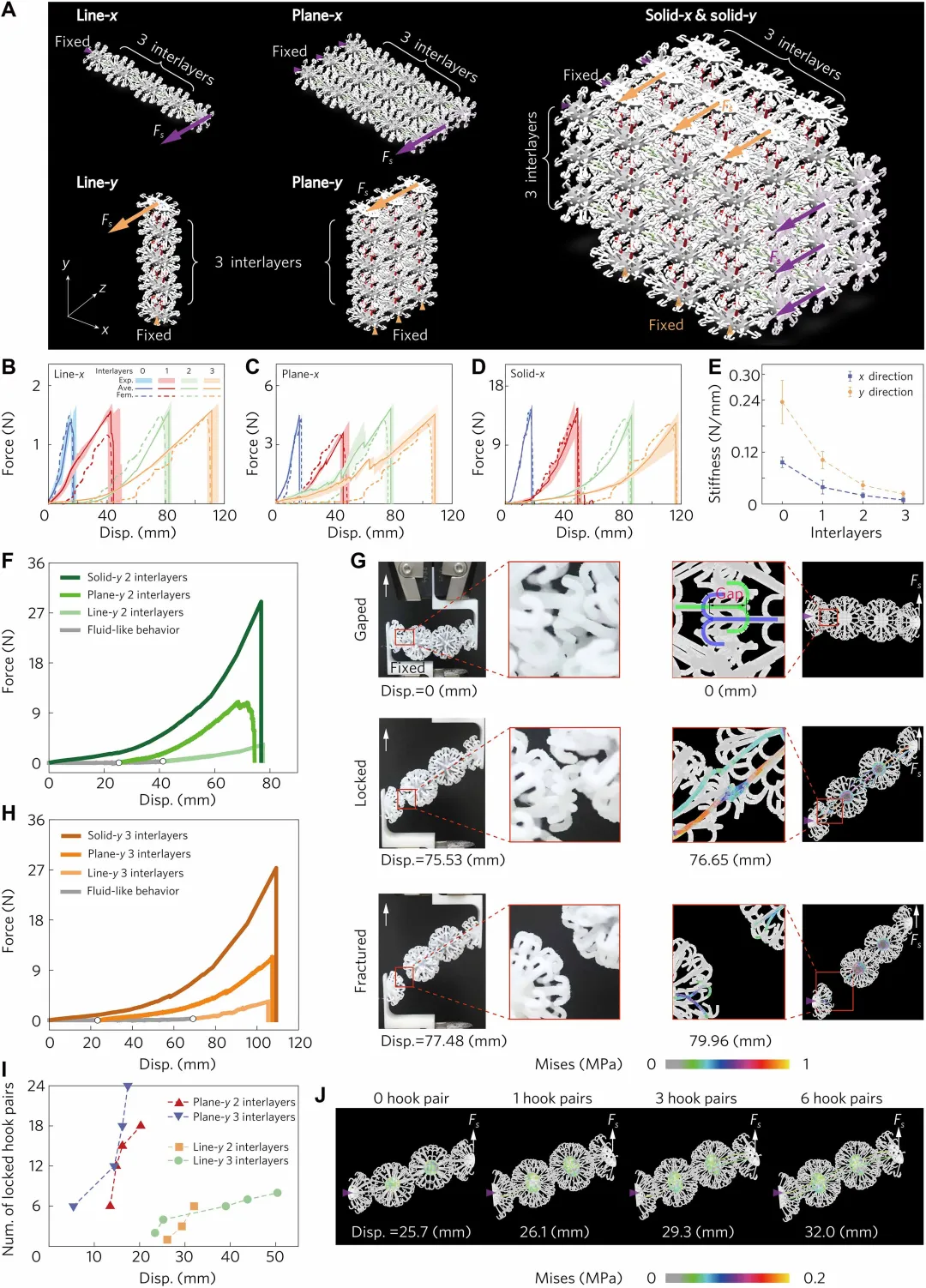 可调的剪切行为:通过调整钩子的串联(增加延展性)与并联(增加强度)排列,可以编程结构的剪切响应,并实现从类流体状态到类固体状态的“滑动-锁定转变”。