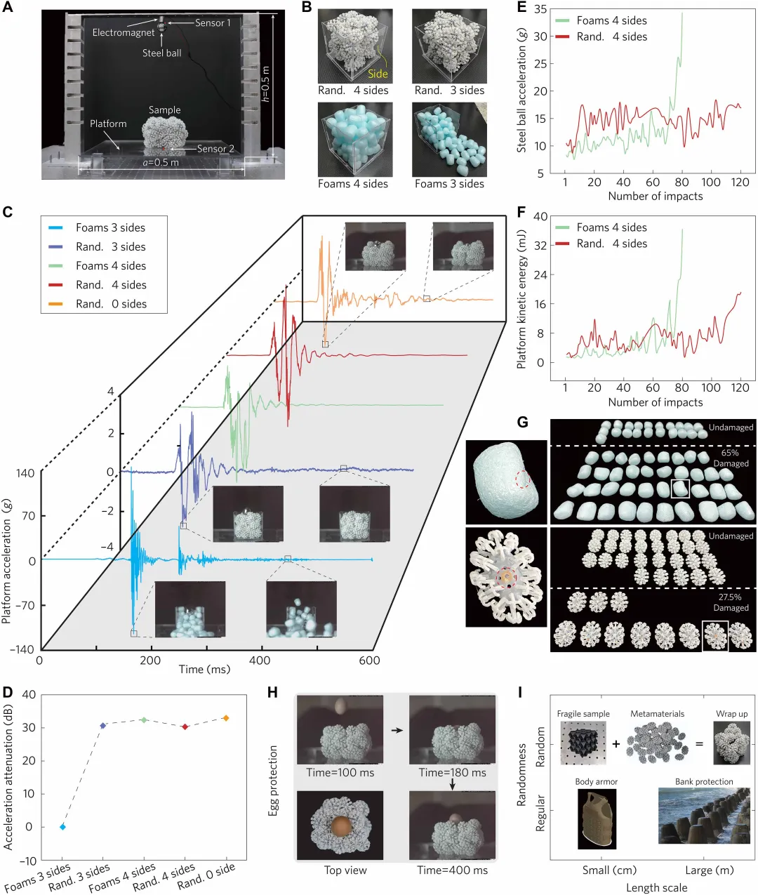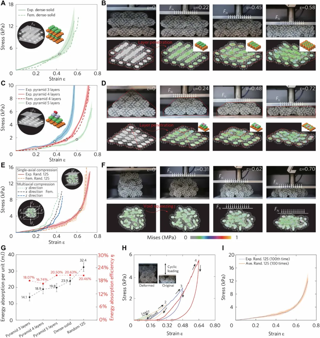高效的能量吸收:在压缩和冲击下,通过“层穿透”和“内部空隙塌缩”等机制耗散能量,其单位体积能量吸收优于有序结构,能量吸收效率约为 20%。