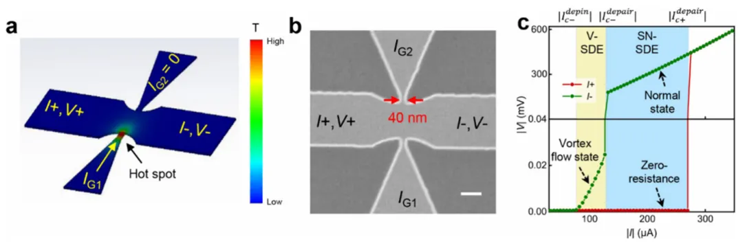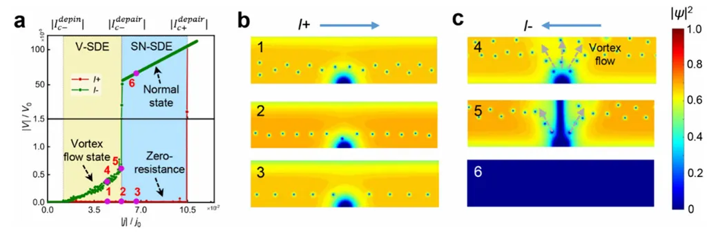 微观机制验证:结合TDGL模拟,揭示热点降低涡旋进入势垒、调制洛伦兹力方向,导致正反向临界电流显著差异。