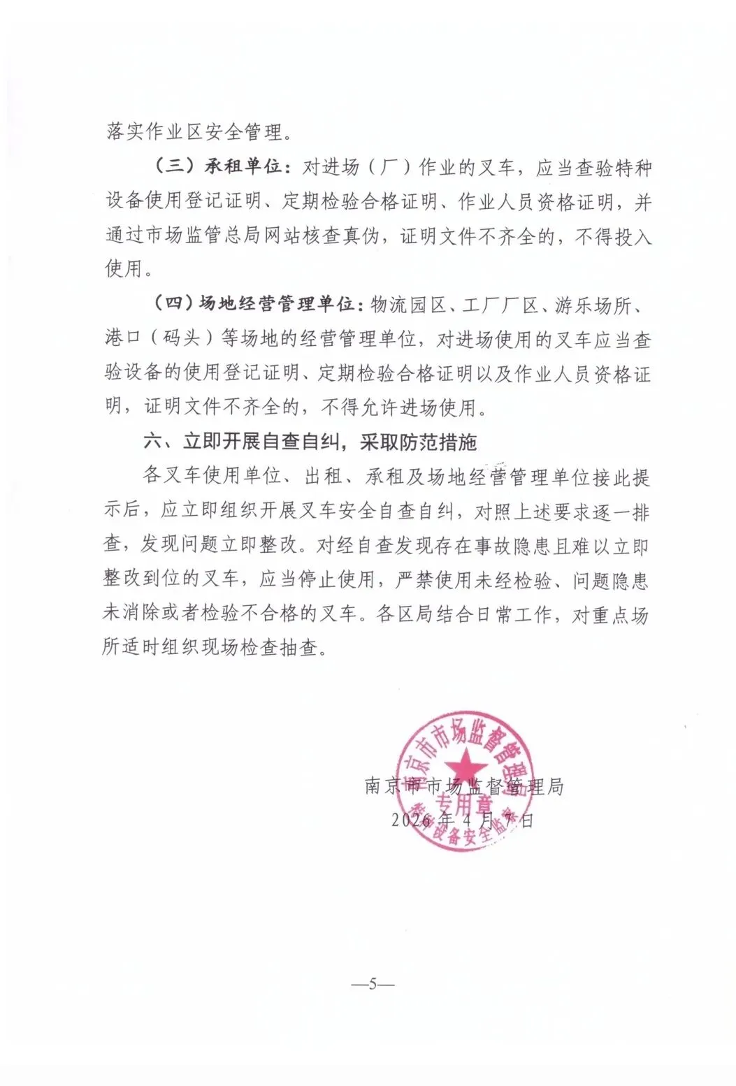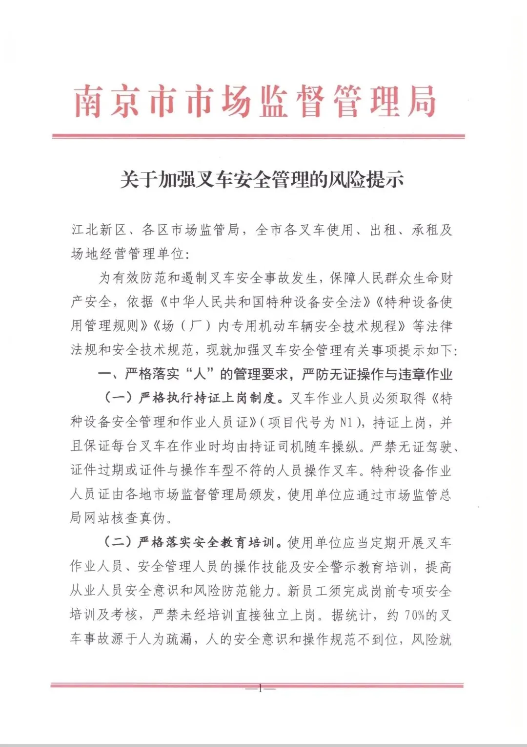 >南京市市场监督管理局发布关于加强叉车安全管理的风险提示