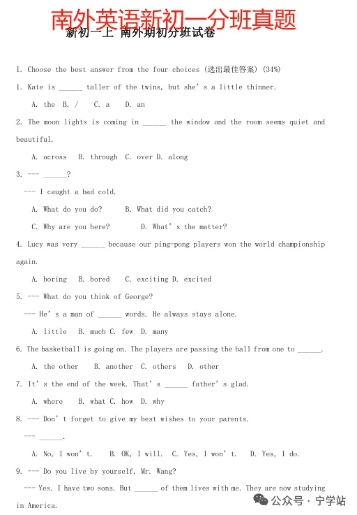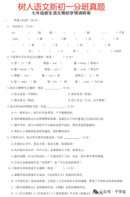 2026年7月-8月:新初一分班考(摸底考)
