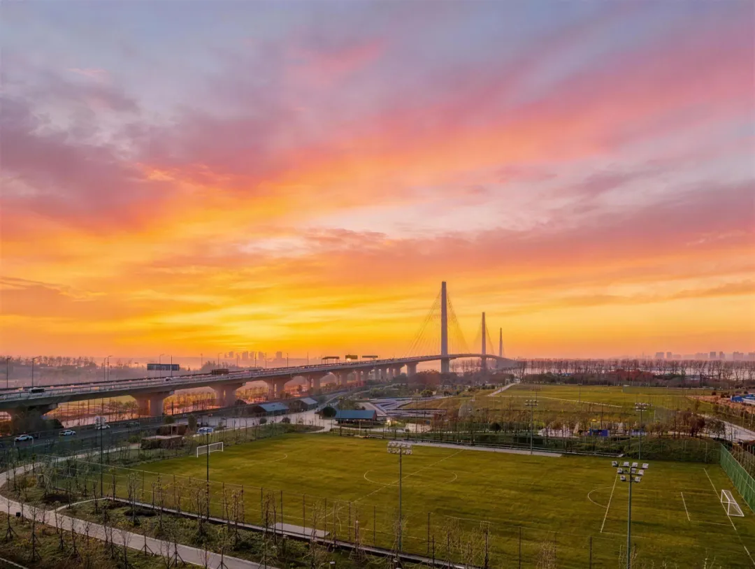 公园名字里的“F₄”很有意思:“FOOTBALL FERVOR(绿茵热血)”“FOREST FUN(林间野趣)”。这里不仅有网红网球场、街头篮球场,更有一片森林足球场——身后长江奔涌,面前五桥横卧,堪称南京独一份的“江景球场”。