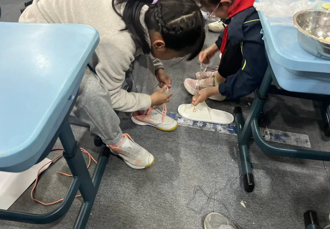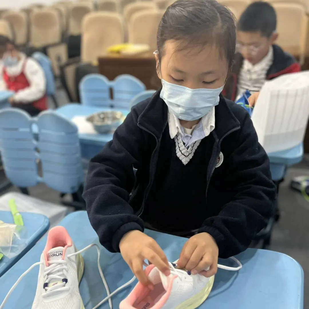 低年级赛场里,系鞋带、剥大蒜、水果拼盘、剪纸项目有序开展。随着一声令下,学生们迅速俯身,双手灵巧地穿梭、打结,一双双原本松散的鞋带,不一会儿变成了整齐美观的蝴蝶结。