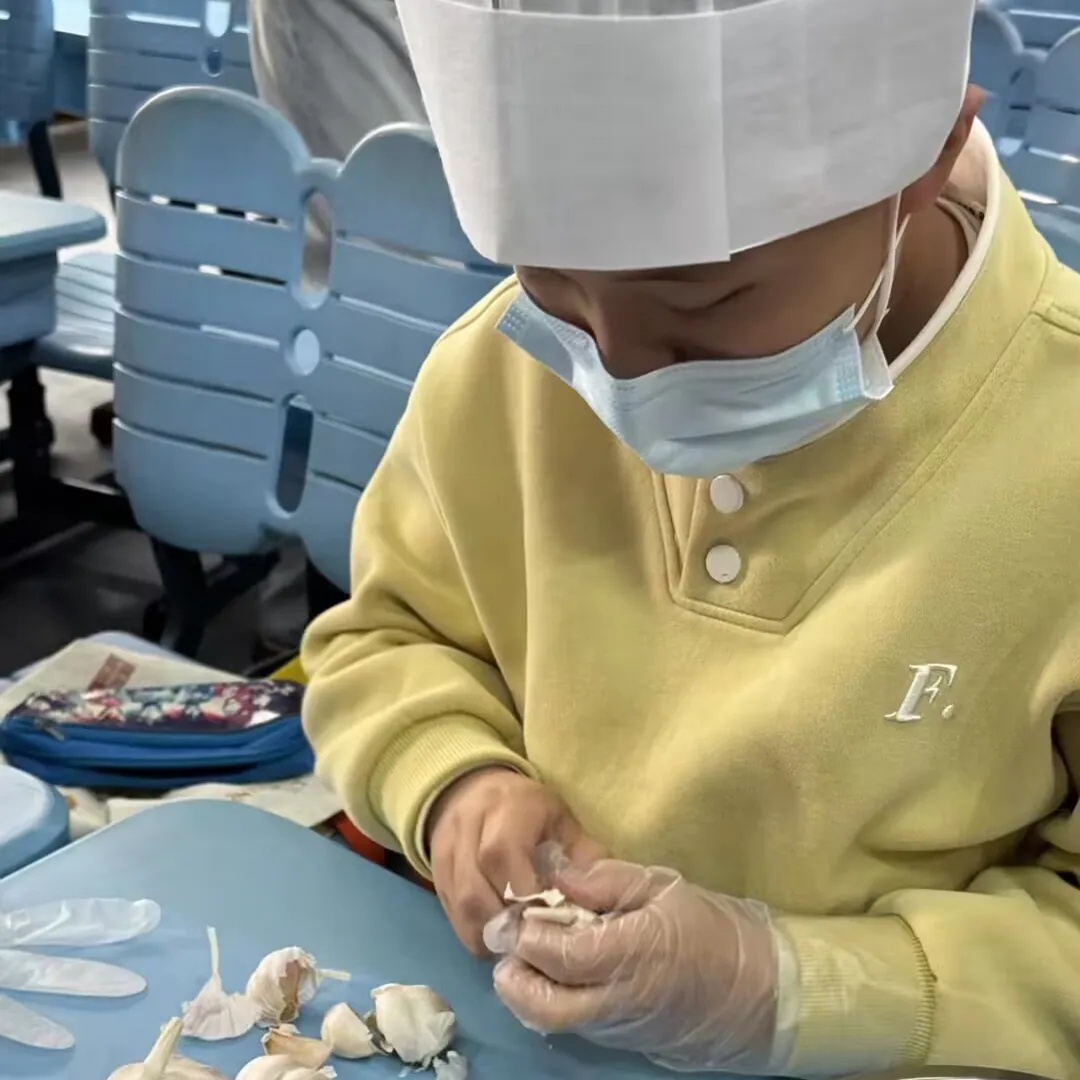 剥大蒜项目比拼激烈。哨声响起,学生们迅速投入,手法娴熟地为大蒜“脱衣”,仔细将完整蒜肉放入指定碗中,同时分类收纳蒜皮、保持桌面整洁。5分钟内,大家比速度、拼细致,既追求剥蒜数量,更保障蒜肉品相。