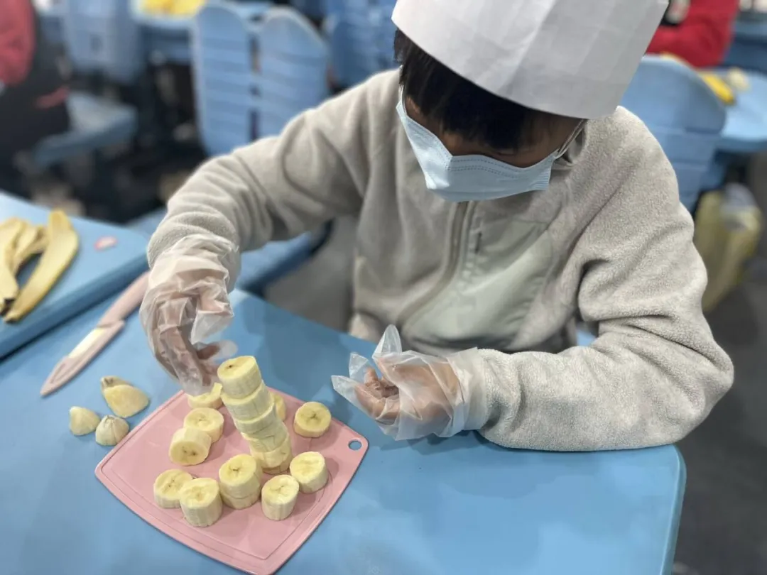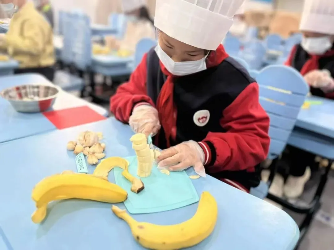 水果拼盘项目中,学生们遵守卫生规范,穿戴好防护用品,迅速将香蕉切成薄片,争分夺秒搭建“香蕉高塔”。大家专注堆叠、细心稳固,在3分钟内全力冲击高度纪录,项目结束后及时清理桌面。该项目充分展现了低年级学生扎实的生活自理能力与良好习惯。