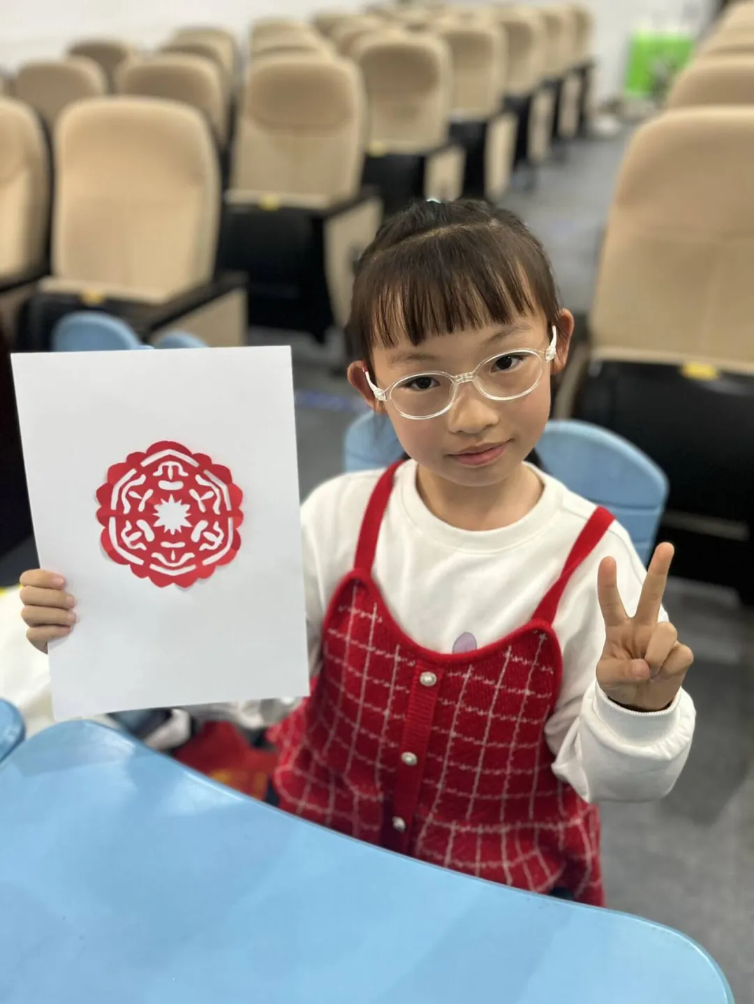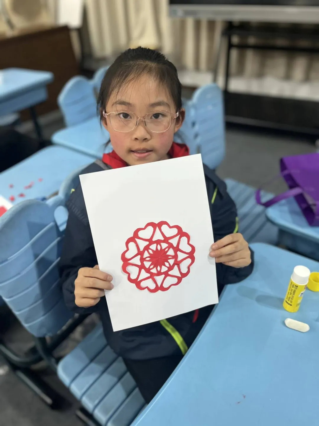 剪纸项目中,学生们全神贯注投入操作:听令后迅速拿起铅笔勾勒图案,随后规范使用剪刀,沿轮廓流畅剪裁,每一刀都精准利落,确保线条连贯、剪口平整。在10分钟内,学生高效完成设计、剪裁、粘贴步骤,作品完整美观。