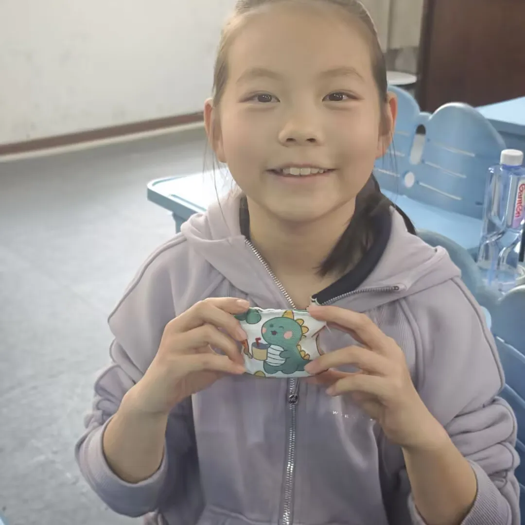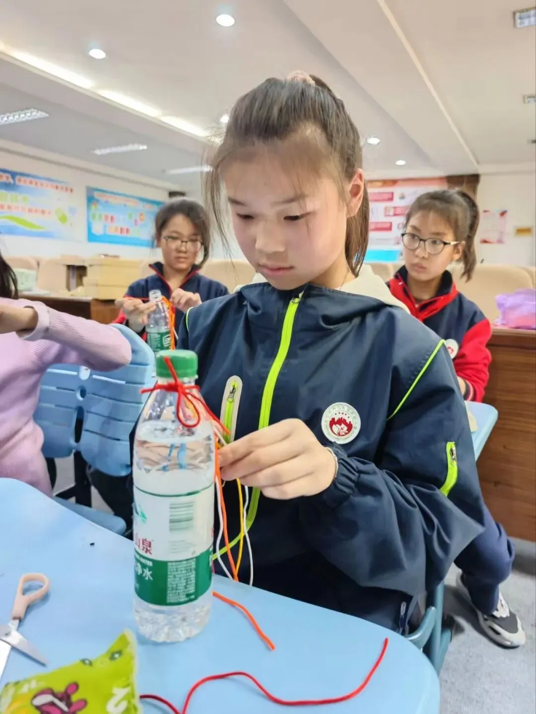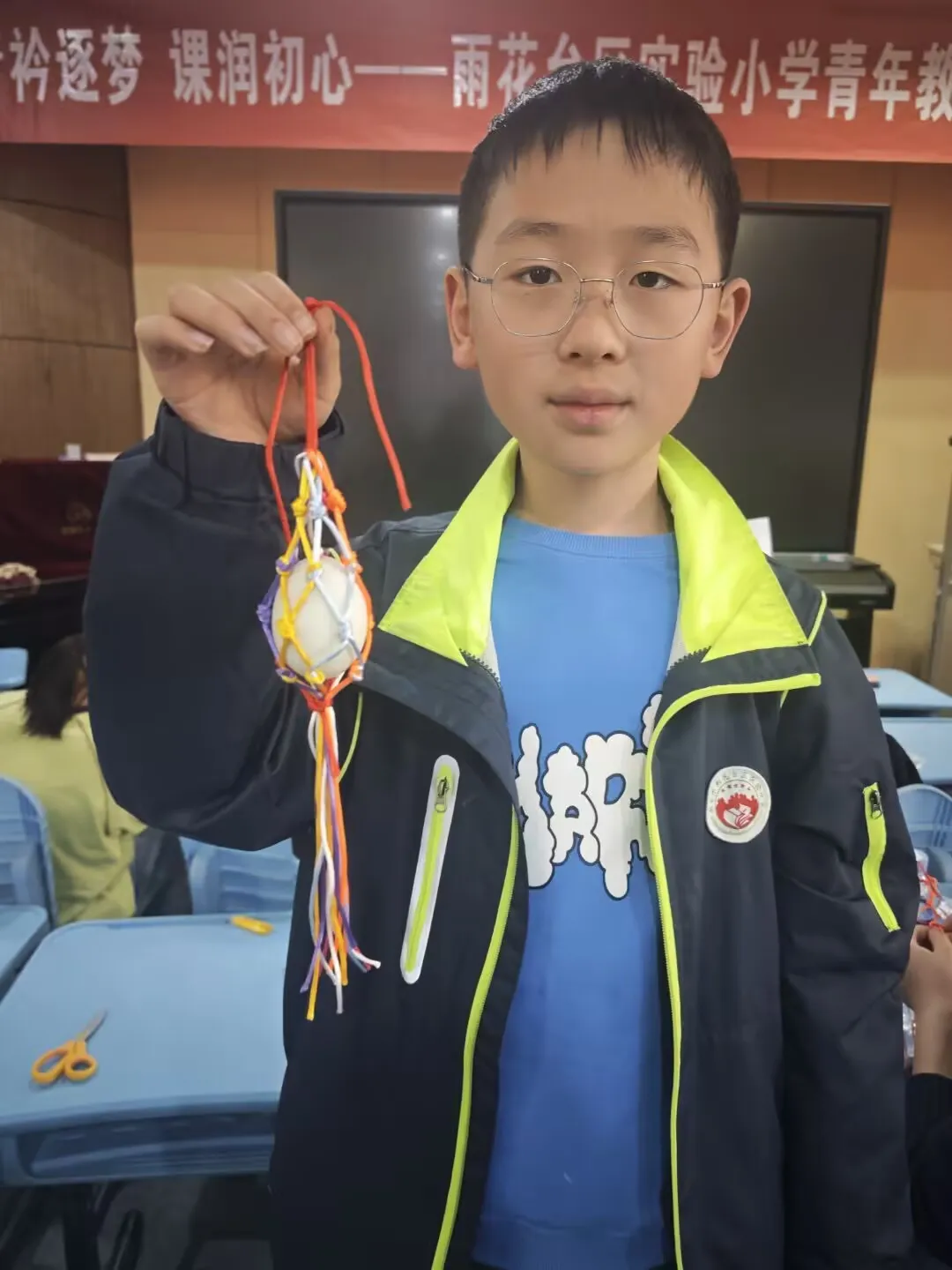 高年级的比拼则更具挑战性,编蛋兜、缝沙包和包装礼品盒项目考验着学生们的耐心与细心。在编蛋兜项目中,学生们取一束绳线,理顺捋平,指尖耐下心来,两两交织打结。一根线穿过另一根,拉紧、扣实,错落缠绕,一排排规整的网眼慢慢成型。手指反复穿梭缠绕,结扣扎实牢靠,疏密排布整齐。缕缕细绳在手中相融相聚,从零散线条,慢慢织成圆润通透的网兜。