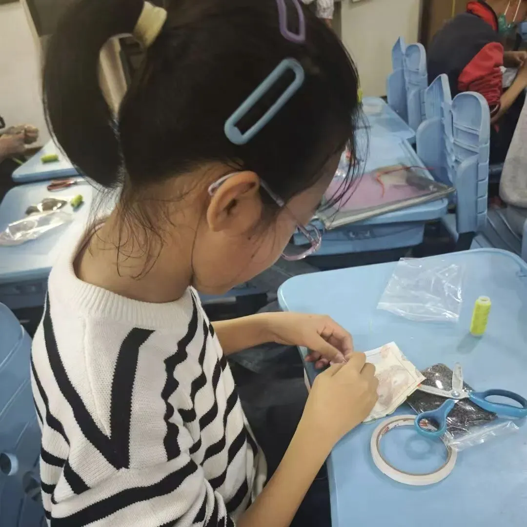 缝沙包项目中,学生们穿针引线、一丝不苟,针线在布料间来回穿梭,封口、填充、缝合每一步都认真细致,一个个饱满规整的沙包,承载着学生们的专注与巧思,赢得了连连称赞。