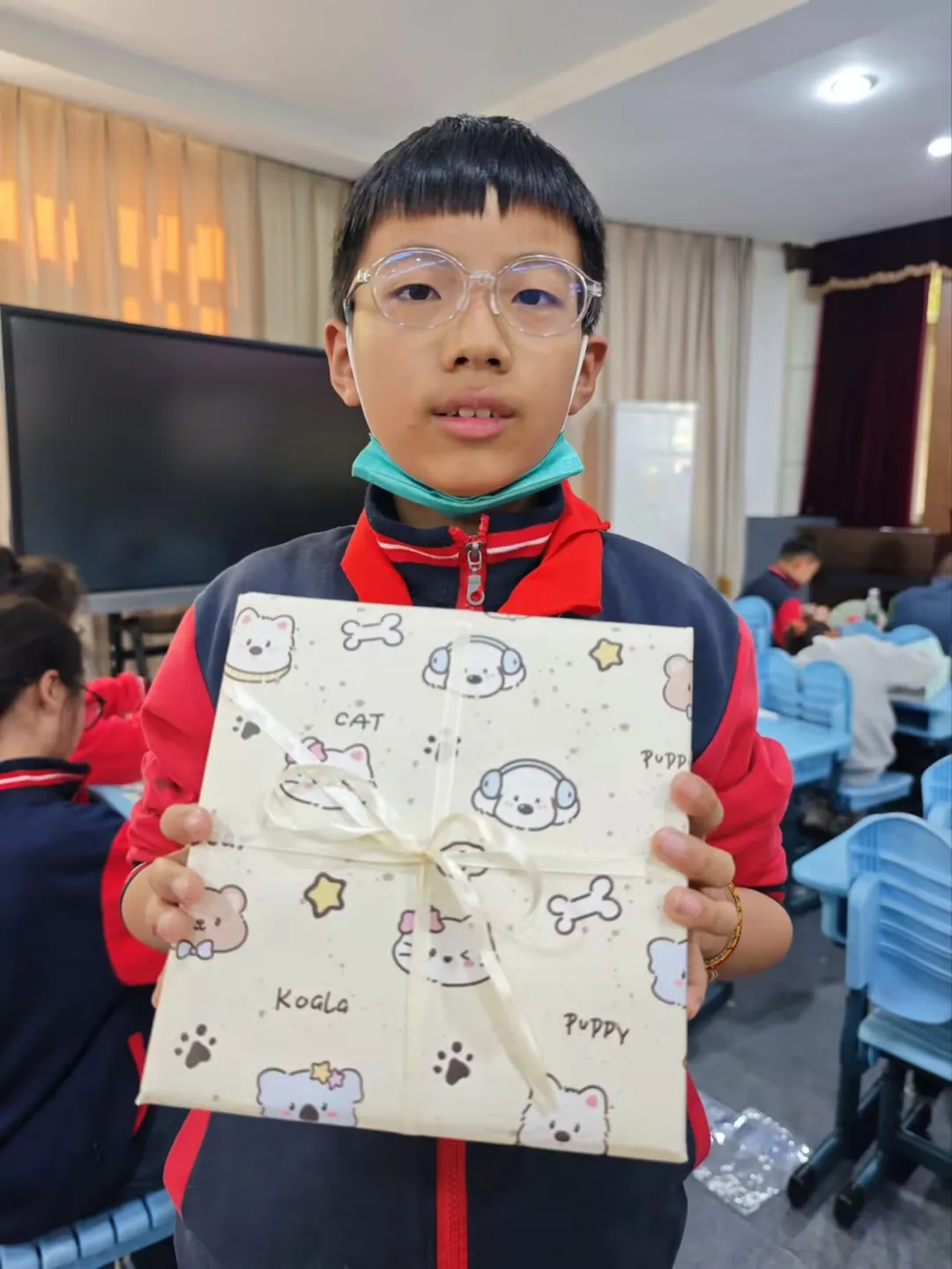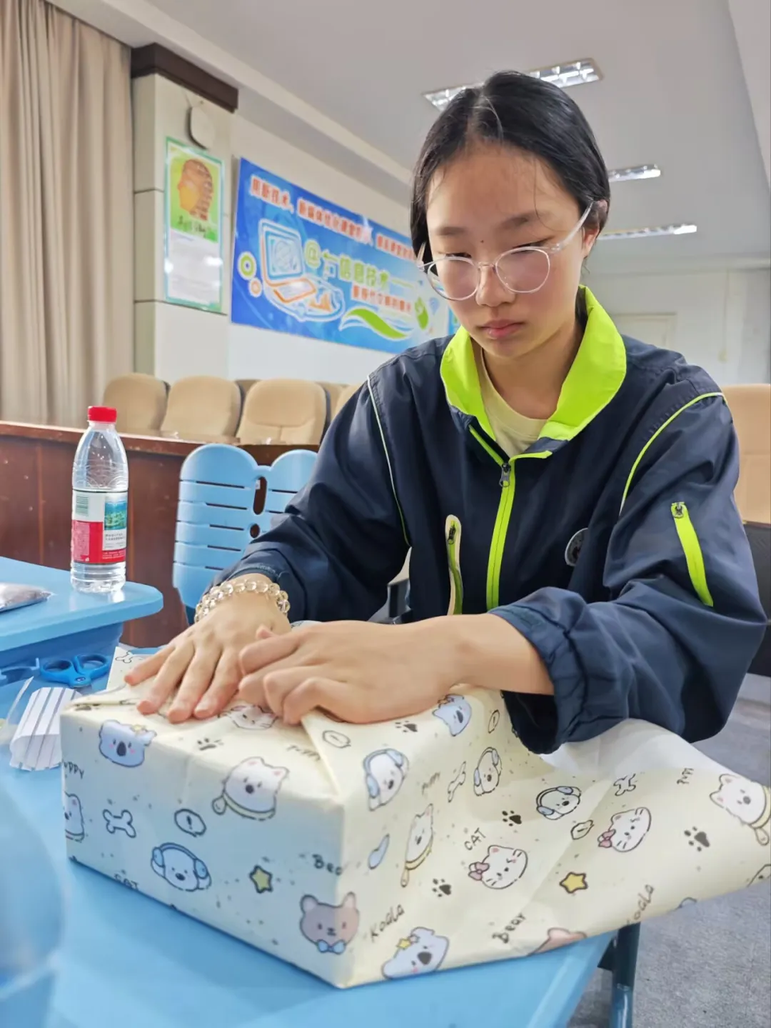 最后一个项目,包装礼品盒。学生们取平整的包装纸铺展开来,将礼盒轻轻摆正,理顺边角,裁去多余纸面。指尖抚平褶皱,把纸张沿着盒身仔细贴合,左右对折,上下收拢,耐心整理每一处折痕。胶带细细粘牢,动作轻柔稳妥,不让边角翘起,再系上彩带,来回缠绕,认真打成好看的蝴蝶结,成品让人欣喜。