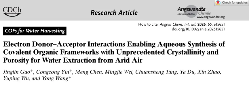 Title:Electron Donor–Acceptor Interactions Enabling Aqueous Synthesis of Covalent Organic Frameworks with Unprecedented Crystallinity and Porosity for Water Extraction from Arid Air