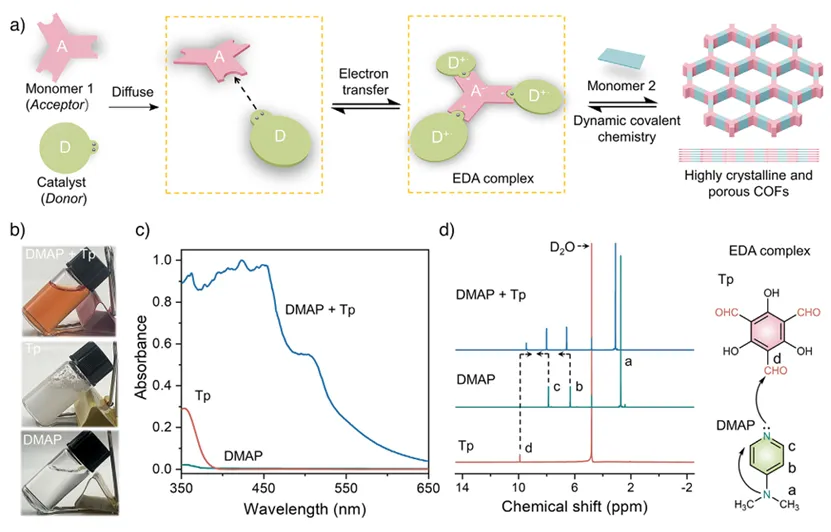 首先,作者系统展示了电子给体–受体(EDA)相互作用在水相中促进COFs合成的形成过程及其多维度实验证据。在示意图(图1a)中,作者提出电子缺陷的醛类单体(如Tp)可与电子富集的催化剂DMAP通过分子间电子转移形成EDA复合物,这一过程能够在反应初期实现单体的预组织,从而为后续有序的动态共价组装奠定基础。随后,通过直观的实验照片(图1b)可以看到,原本在水中呈浑浊分散状态的Tp,在加入DMAP后迅速转变为均一透明的橙色溶液,这一显著变化表明EDA复合物的形成不仅改变了体系的光学性质,也显著提升了疏水单体在水中的溶解性。进一步地,紫外-可见吸收光谱(图1c)中出现明显的吸收红移,说明体系中发生了有效的电子转移过程,这是EDA相互作用的典型特征;而¹H NMR谱图(图1d)中DMAP与Tp相关氢信号分别发生高场和低场位移,则从分子层面进一步验证了电子从DMAP向Tp转移,导致电子云分布发生改变。