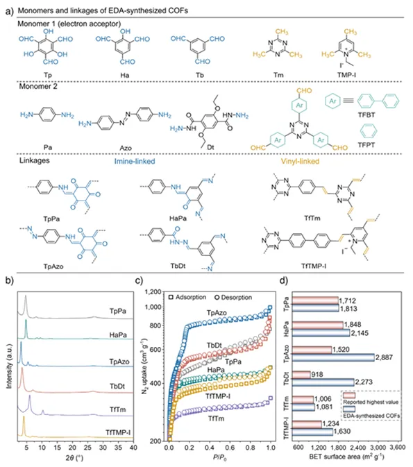 接着,作者从结构多样性、结晶性以及孔结构性能三个方面系统展示了基于EDA策略合成COFs的优越性。首先,在(图2a)中给出了不同单体及其构筑的COFs结构示意,说明该方法不仅适用于亚胺键连接体系,还可拓展至乙烯基等多种连接类型,体现出良好的普适性。粉末X射线衍射图谱(图2b)显示所有材料均具有清晰且尖锐的衍射峰,表明其具有高度有序的晶体结构。高分辨透射电镜结果也进一步佐证了这一点。氮气吸附–脱附等温线(图2c)则揭示这些COFs均具有典型的多孔特征和较高的比表面积。更为重要的是,作者对比了本工作与已报道COFs的BET比表面积,可以看到EDA策略所得材料的比表面积接近甚至达到理论极限,刷新了多种COFs体系的最高纪录(图2d)。这表明通过EDA相互作用提升反应可逆性与单体溶解性,有效减少了结构缺陷,使框架更加规整有序。