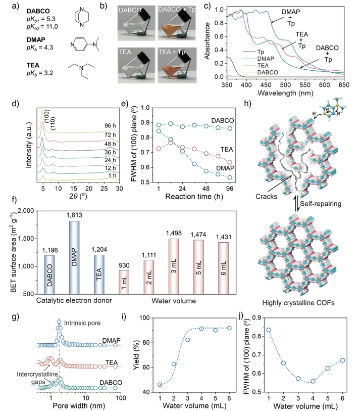 图3. 不同催化电子给体及水用量对TpPa的EDA合成影响。(a)三种电子给体催化剂的化学结构及pKb值;(b) DABCO、TEA及其EDA复合物在水中的照片;(c)不同电子给体形成的EDA复合物的归一化紫外–可见吸收光谱(均在水中、使用1 mm光程石英比色皿测定);(d)采用DMAP作为催化电子给体,在不同反应时间下合成TpPa的PXRD图谱;(e)对应(100)晶面半峰宽(FWHM)的变化;(f)不同电子给体条件下以及不同水用量条件下合成TpPa的BET比表面积;(g)不同电子给体条件下TpPa的孔径分布;(h)通过自修复过程形成高结晶COFs的示意图;(i)不同水用量下TpPa的产率;(j)在DMAP催化下,不同水用量合成TpPa的(100)晶面半峰宽变化。