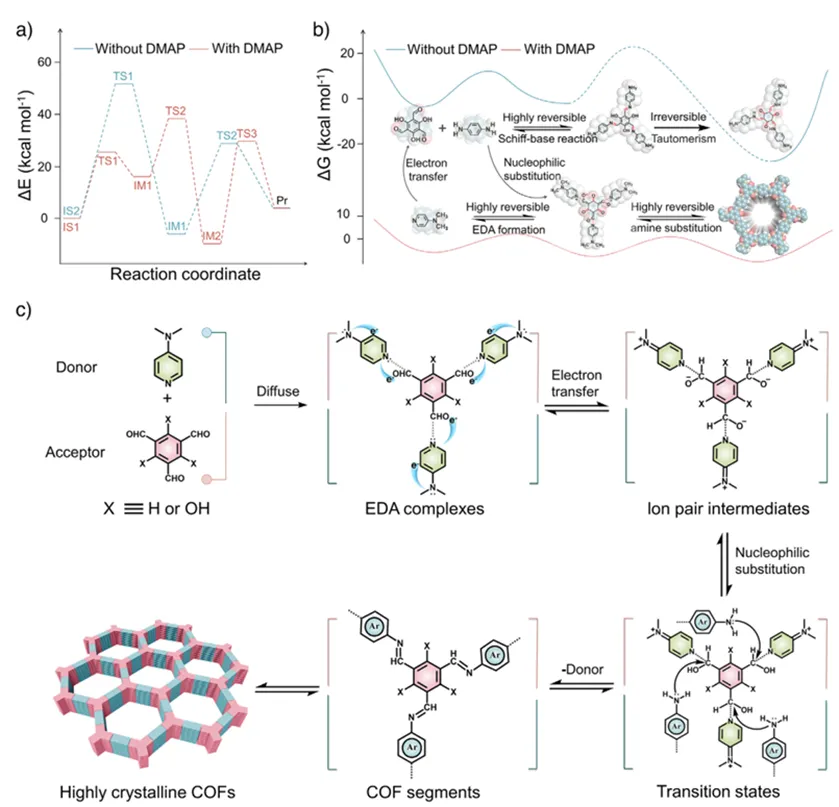 图4. 基于EDA策略合成TpPa的反应机理与路径分析。(a) Tp与不同电子给体反应的能量变化路径,其中Tp与Pa在有无DMAP条件下的混合体系被设定为初始态(IS),最终生成TpPa产物(Pr);(b)通过可逆席夫碱反应及不可逆β-酮烯胺互变异构的直接缩合路径,与通过EDA复合物形成路径的吉布斯自由能变化对比;(c)经由EDA复合物进行反应的路径示意及分子在分子间电子转移过程中的结构转变。