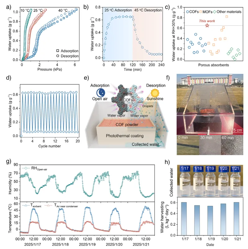 图5. EDA合成的TpPa用于空气取水的性能。(a)在10 ℃(绿色)、25 ℃(红色)和40 ℃(蓝色)下测得的水蒸气吸附等温线;(b)在30%相对湿度下,25 ℃吸附和45 ℃脱附的动态水吸附–脱附曲线;(c)不同多孔材料在空气中水吸附能力的对比(详见表S3);(d)吸附(25 ℃)–脱附(45 ℃)循环稳定性测试;(e)空气取水装置的设计示意图;(f)装置实物照片及冷凝器壁面随时间形成的水滴;(g)露天环境中空气、冷凝器附近空气及TpPa粉末的温度与湿度变化记录;(h)空气取水速率及对应收集水的照片(测试地点为南京东南大学操场)。