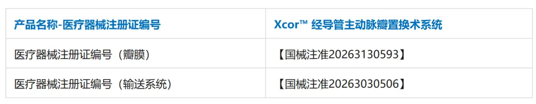 公司自主研发的Xcor™经导管主动脉瓣置换系统已于近日获得国家药监局批准上市。