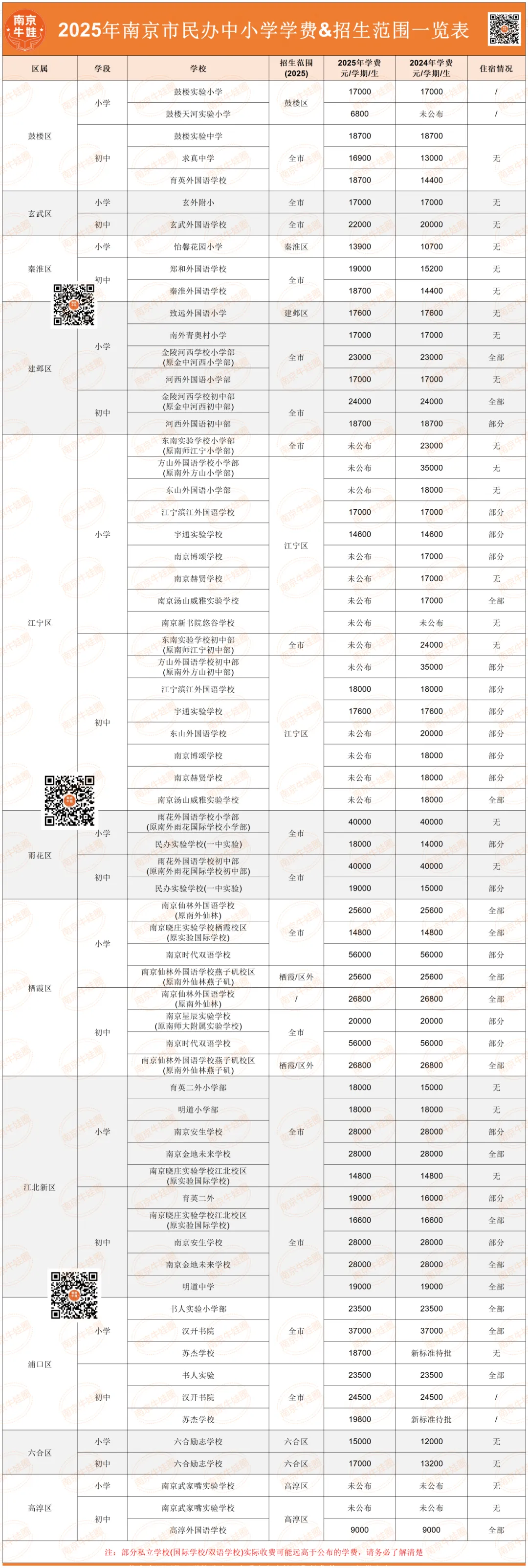 阿初整理了2025年南京民办中小学学费一览表: