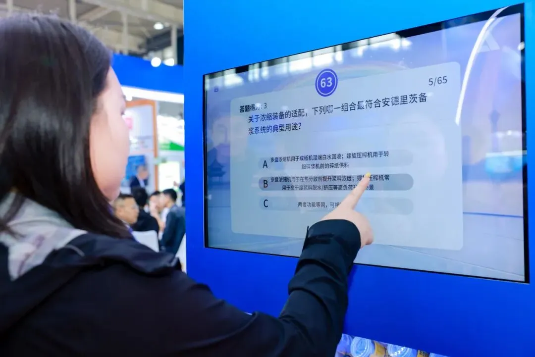 今年首次亮相的「MORE-KNOWHOW答题互动区」成为全场最具吸引力的体验场景之一。观众只需扫码参与答题,即可随机进入由五大业务单元与安德里茨品牌共同构建的问答池——从纸机、非织造、备浆系统到智能化、服务体系,全面覆盖安德里茨的核心优势领域。轻松参与却暗藏专业深度,不少行业客户在互动中展开更深入的技术交流,现场氛围轻松又专业,让“Know-how”以更具体验感的方式传播开来。