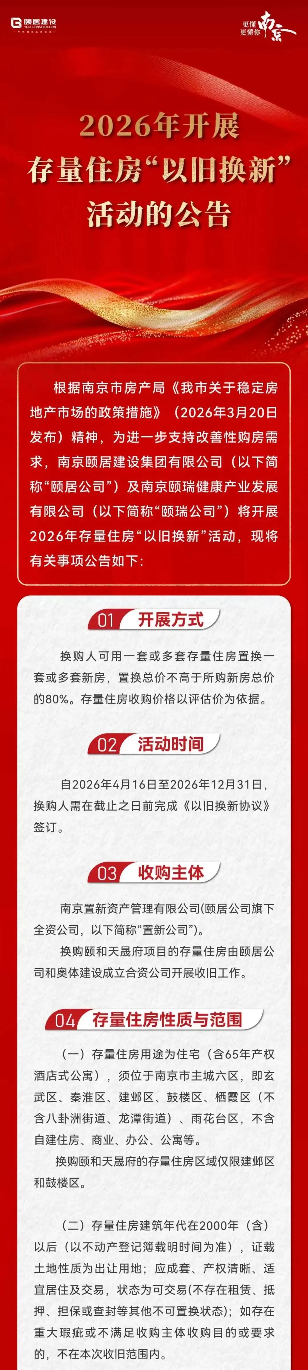就在刚刚,颐居建设发布2026年存量住房“以旧换新”公告!9个项目参与,分布河西中、河西南、江核、岱山、城北、汤山等。