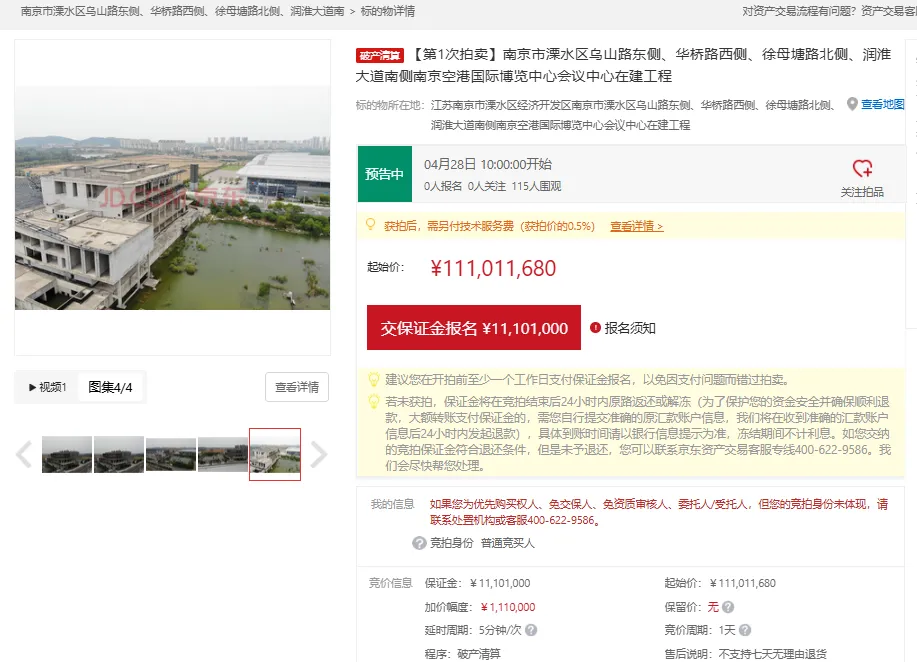 近日,“南京京市溧水区乌山路东侧、华桥路西侧、徐母塘路北侧、润淮大道南侧南京空港国际博览中心会议中心在建工程”即南京空港国际博览中心配套的会议中心以及酒店上架京东资产交易平台。