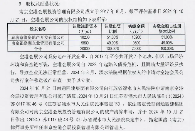 公开资料显示,南京空港会展投资管理有限公司成立于2017年8月,由华夏幸福、银城分别持股51%、49%。