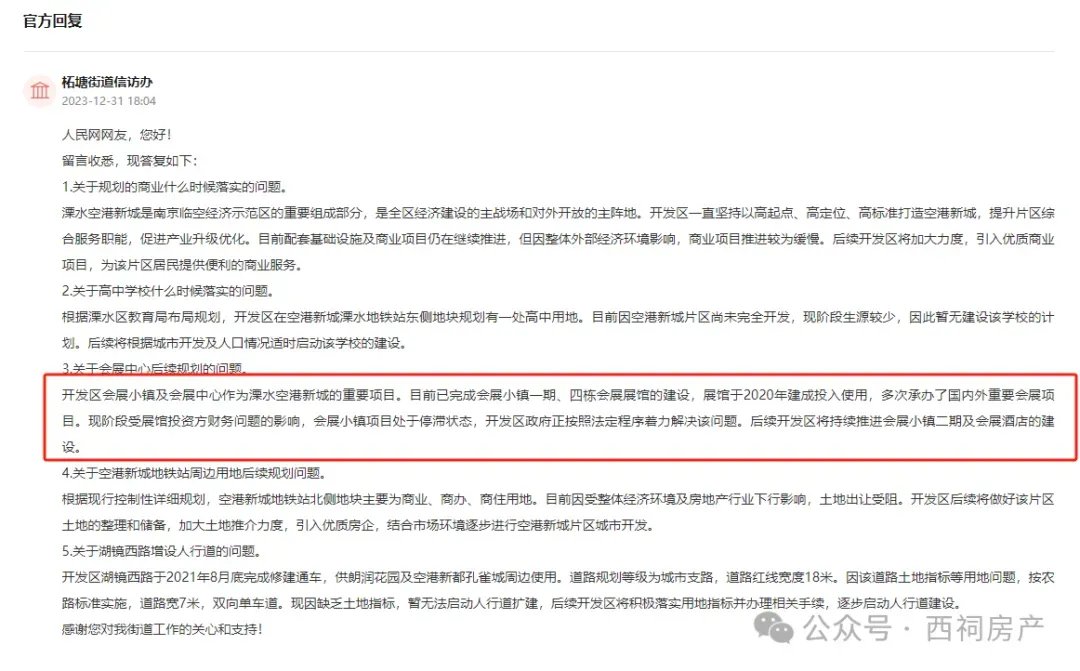 遗憾的是,南京空港国际博览中心酒店配套以及二期项目已经停滞。2023年12月31日,官方表示现阶段受展馆投资方财务问题的影响,会展小镇项目处于停滞状态,政府正按照法定程序着力解决该问题,后续将持续推进会展小镇二期及会展酒店的建设。