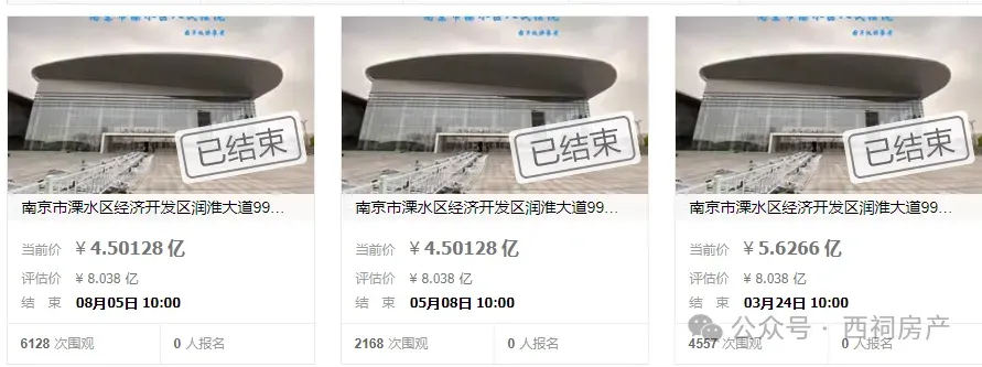 同年,南京空港国际博览中心就被挂上法拍平台,历经三度流拍:资产评估价8.038亿元,后续两度降价,最终底价跌至4.5亿元,近乎半价抛售,无人接手。
