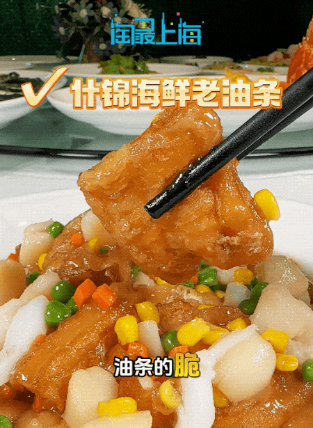 上海人对油条的开发已经不仅仅是早餐,什锦海鲜的浓醇精华,悄悄潜伏在油条孔隙中,咬下时,外层是老油的焦香酥脆,内里饱含鲜美的海鲜汁酱,鲜味回荡,油条也吃出了爆汁感。