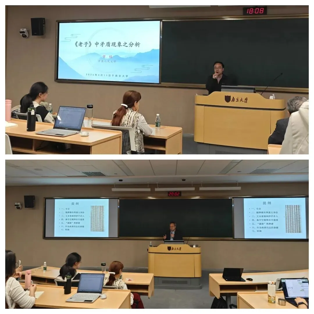 2026年4月13日晚,中国人民大学曹峰教授、武汉大学杨华教授受邀做客南京大学南苏讲坛,分别以《〈老子〉中矛盾现象之分析》《中国古墓为何随葬书籍》为题,为南京大学苏州校区师生带来有关《老子》哲学思想、古代丧葬文化制度的深度学术讲座。本次讲座由南京大学全球人文研究院郭静云教授主持,现场学术氛围浓厚,师生互动交流深入,形成良好学术对话氛围。