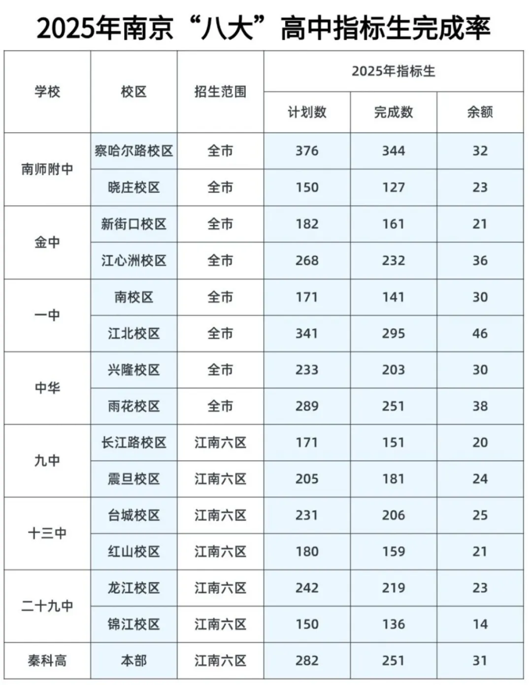 雨花校区名额向雨花台区倾斜,指标生分数线略低于其他六大名校,完成率稳定,适合雨花台区及周边区域的孩子。