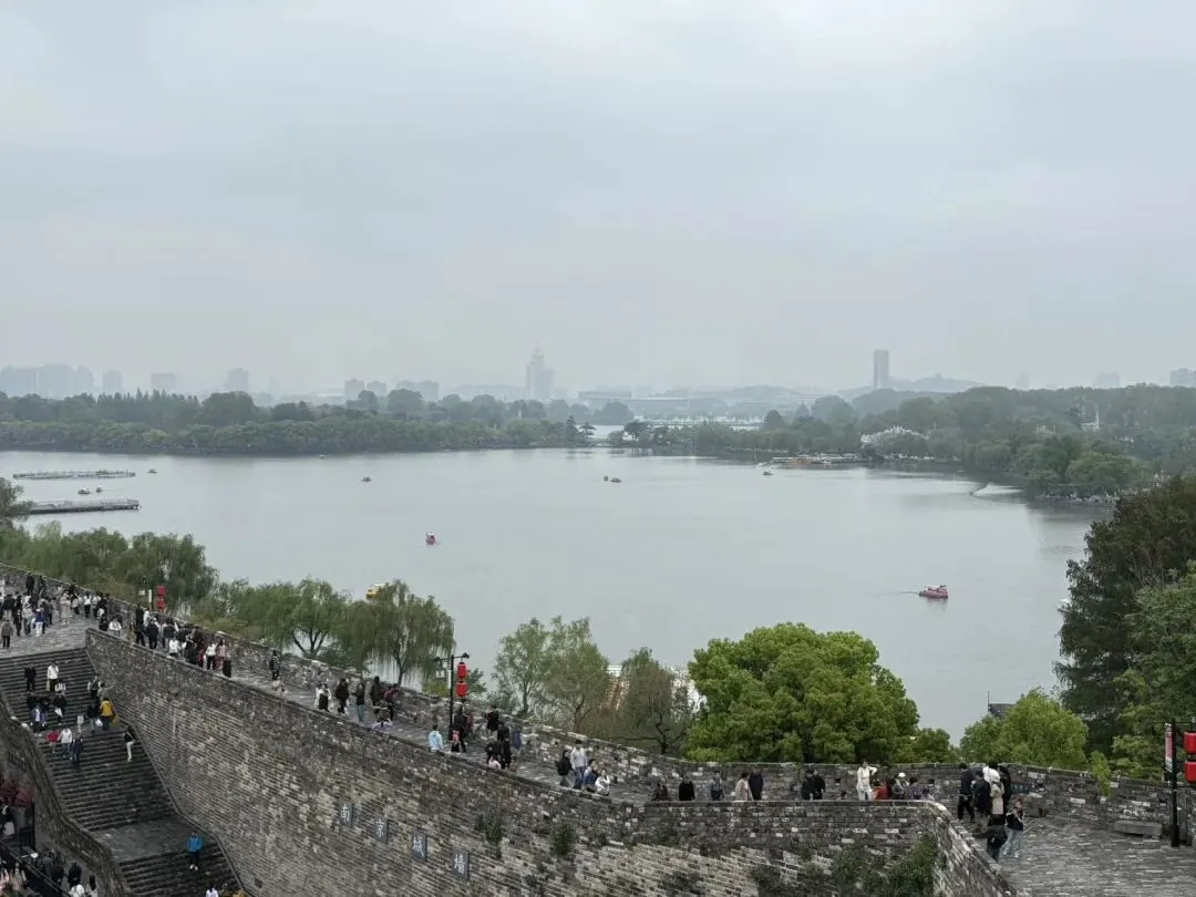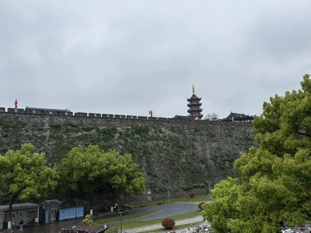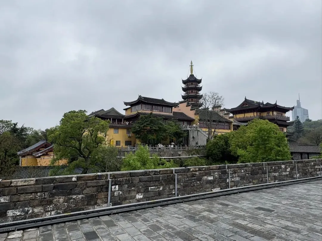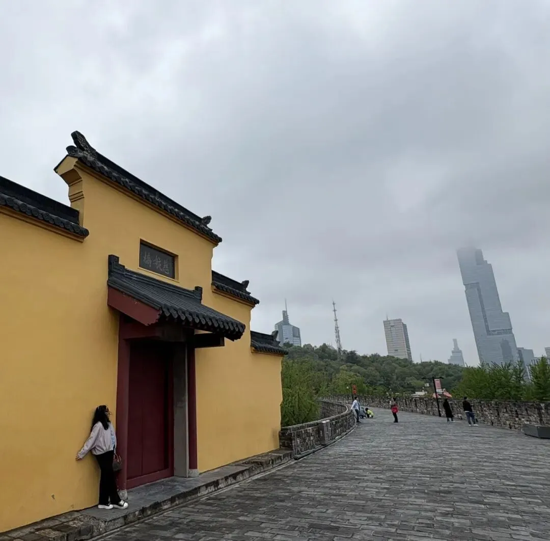 第五日最是悠长。上午登台城,从解放门走到玄武门,南京城墙城内有13个门,这段城墙风景最佳,可看玄武湖全景。城墙上回头一望——古鸡鸣寺的黄色墙垣与我们入住的紫峰大厦的玻璃幕墙,同时收入眼底。古老与现代,佛塔与摩天楼,就这样站在同一幅画面里。我拍了张照,觉得这大概就是南京最好的对比:一边是南朝四百八十寺,一边是二十一世纪。