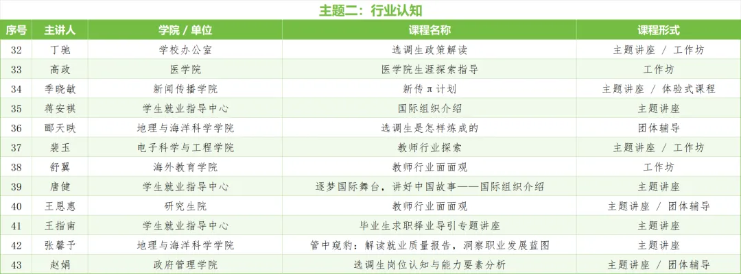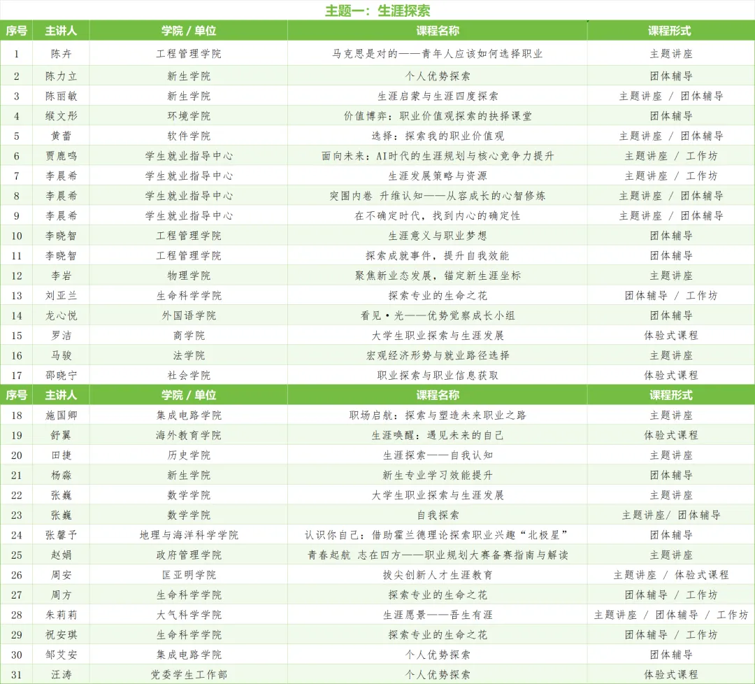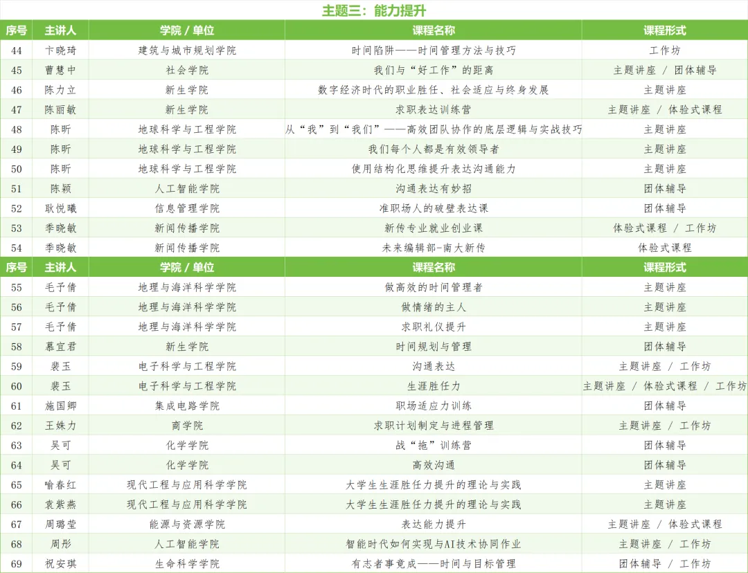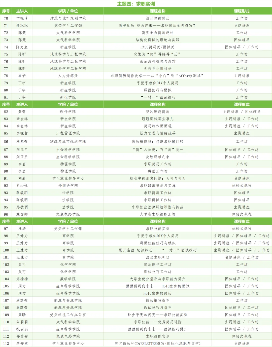 欢迎各学院、党团支部、班级及学生社团预约课程,既可邀请本院师资,也可跨院联动共享资源。如需协助对接讲师,欢迎联系学生就业指导中心贾老师(025-89681571)。