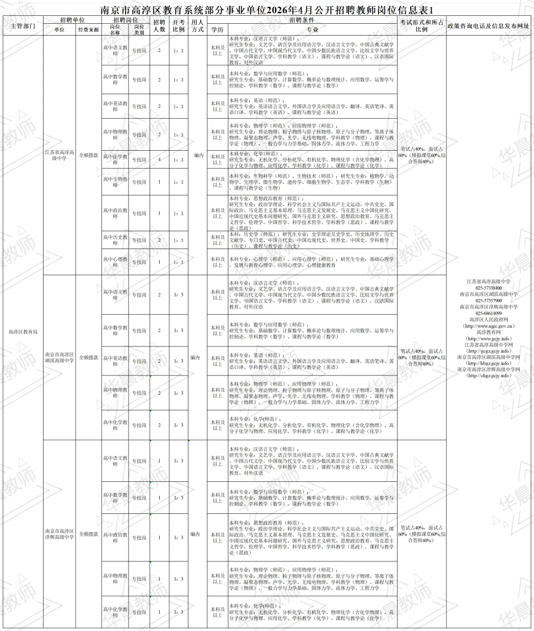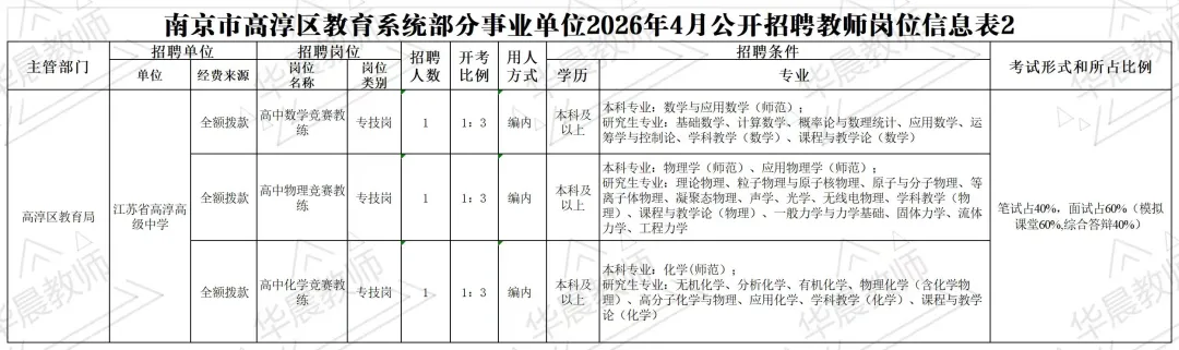 本次招聘相关信息在高淳区人民政府网(http://www.njgc.gov.cn)、高淳教育网(http://www.gcjy.info)、江苏省高淳高级中学网(http://gcgz.gcjy.info)、南京市高淳区湖滨高级中学网(http://hbgz.gcjy.info)、南京市高淳区淳辉高级中学网(http://chgz.gcjy.info)等网站发布。具体的招聘岗位、数量、资格条件等详见附件:《南京市高淳区教育系统部分事业单位2026年4月公开招聘教师岗位信息表1》及《南京市高淳区教育系统部分事业单位2026年4月公开招聘教师岗位信息表2》,以下简称《岗位信息表1》及《岗位信息表2》。