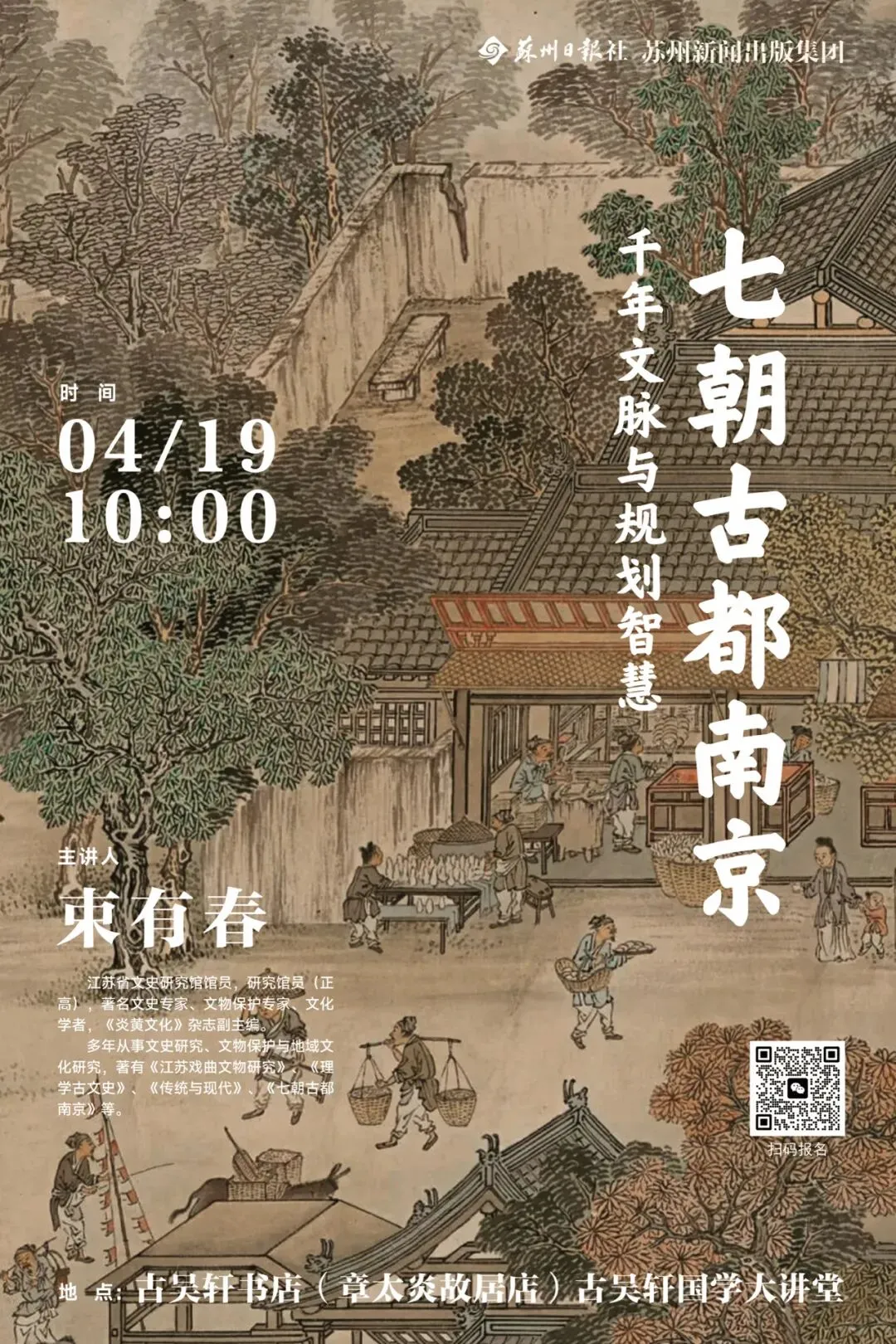 本周日(4月19日),《七朝古都南京》作者、资深文史研究专家束有春,将做客古吴轩书店(章太炎故居店)国学大讲堂,以“千年文脉与规划智慧”为题,带着深耕史料的严谨与温度,带我们一同回顾这段千年往事。