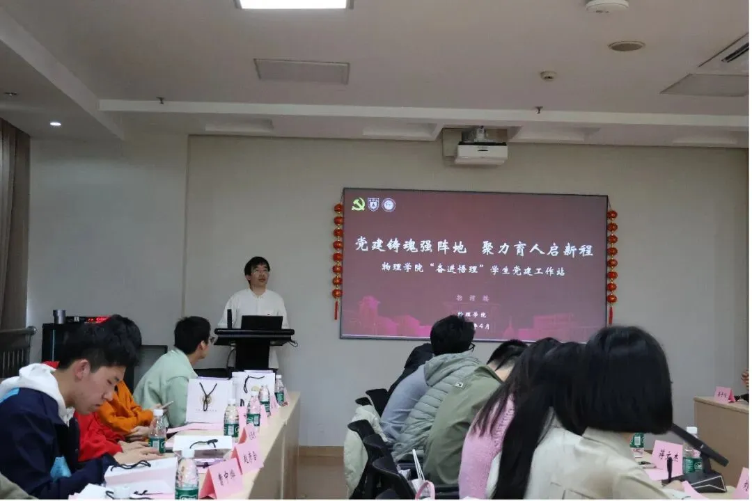 南京大学物理学院学生党建工作站站长杨文杰同学首先介绍了物理学院的基本情况。他介绍了物理学院的悠久历史、教学与科研体系、学生工作总体情况,并重点阐述了物理学院党建工作的开展情况,包括院系工作站党员基础、特色党建活动等内容。