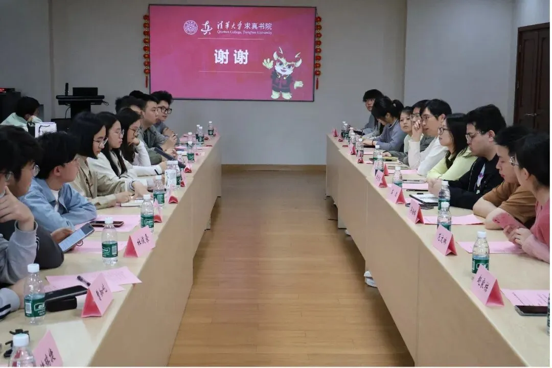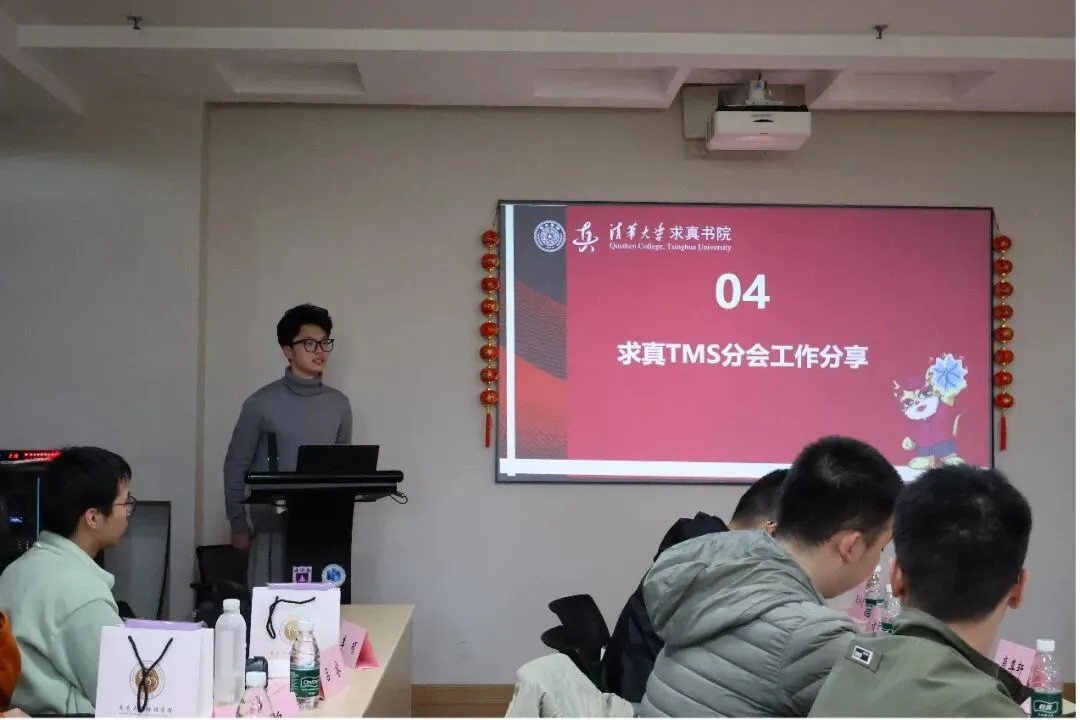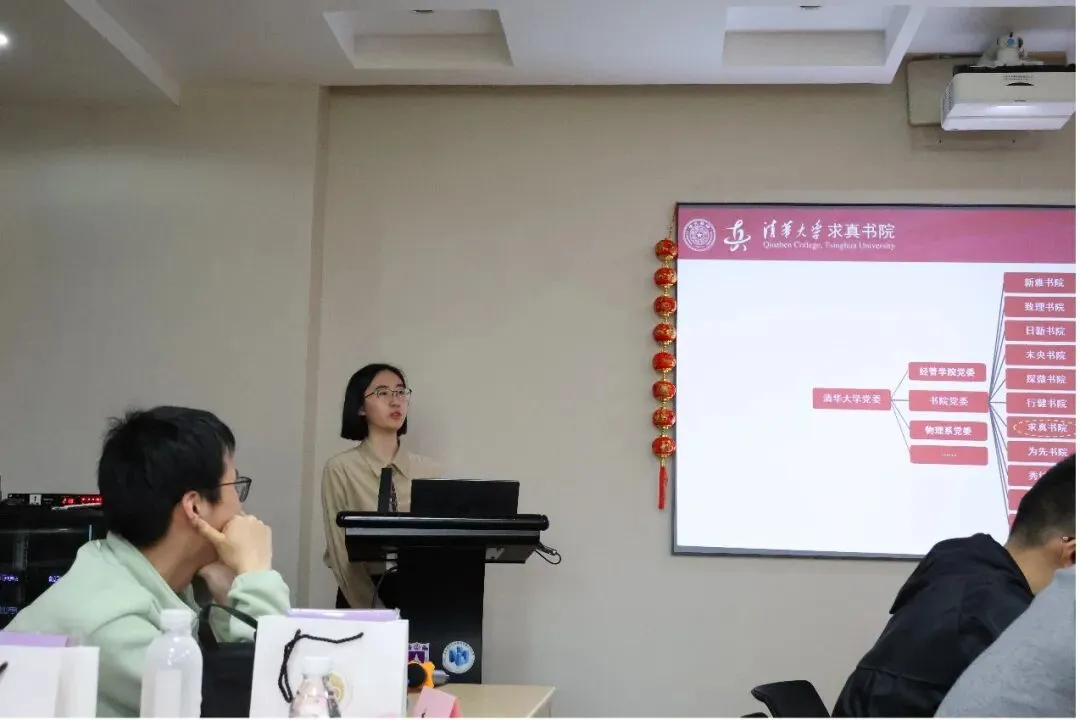 随后,清华大学求真书院学生代表陈靖宇介绍了求真书院的基本情况。他围绕书院成立背景、师资力量、特色课程与活动、学生工作开展及班团建设等方面进行了系统分享,展现了求真书院在基础学科人才培养与党建育人方面的探索实践。清华大学求真书院党建辅导员李昕妙则介绍了书院的基本党建情况,肖尊轩同学就求真书院TMS分会的工作进行了专题分享,展示了书院在理论学习与组织建设方面的探索。