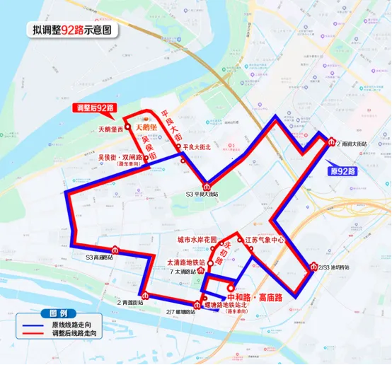 * 拟增设站点:太清路地铁站、城市水岸花园、江苏气象中心、平良大街北、天鹅堡西、吴侯街·双闸路(仅内圈停靠)、螺塘路地铁站北(仅外圈停靠)。