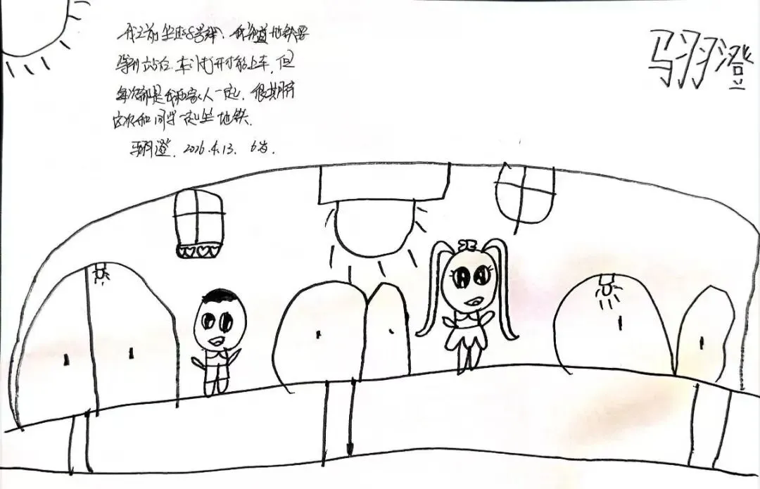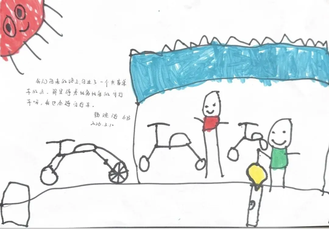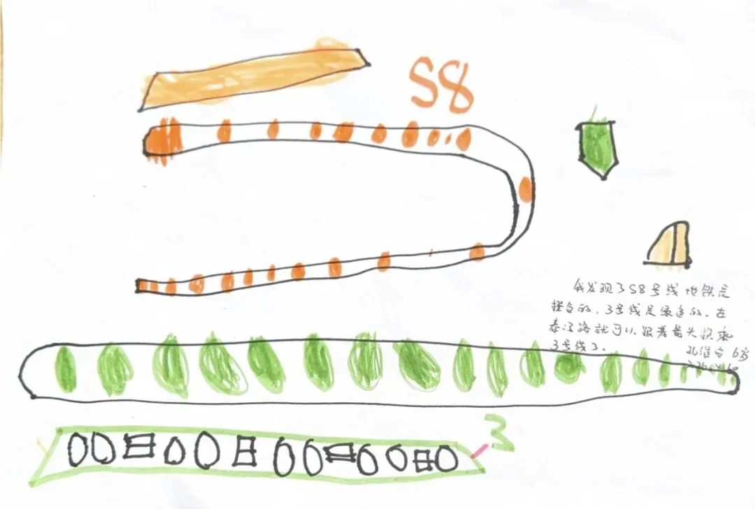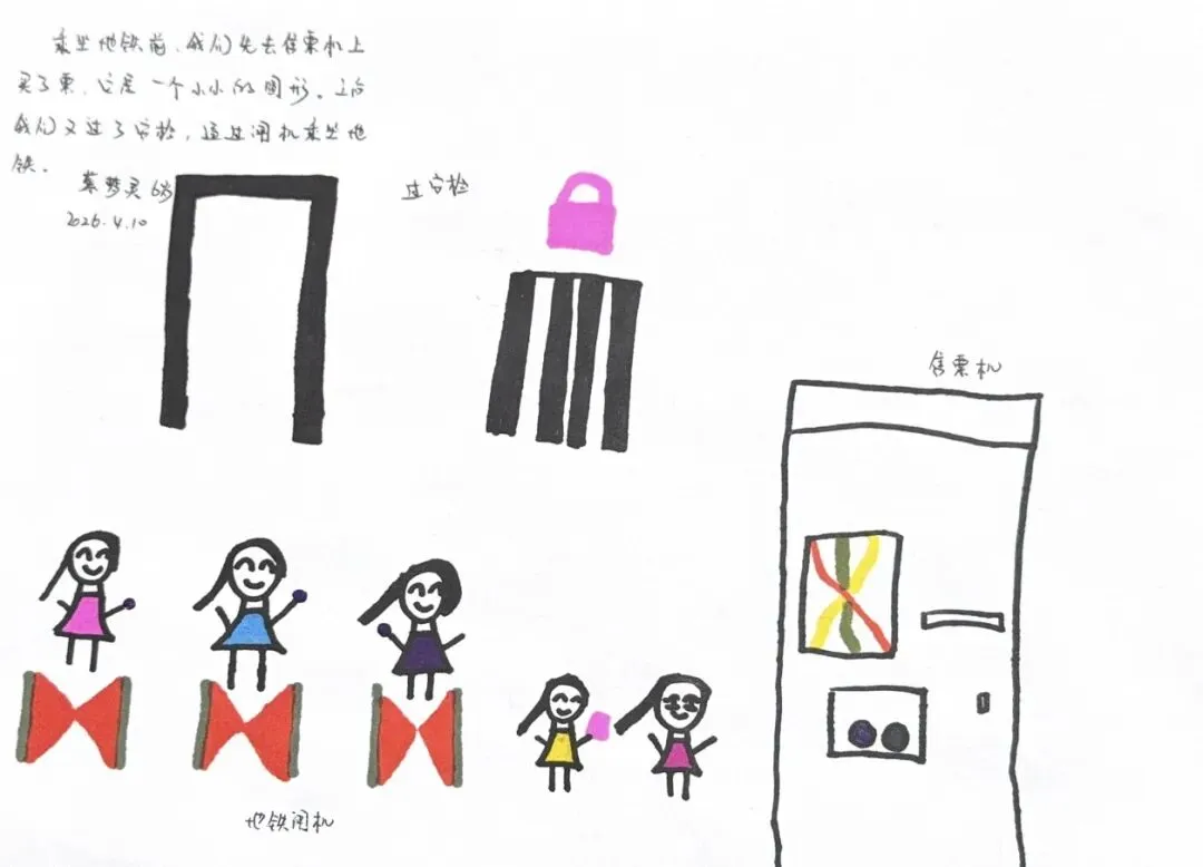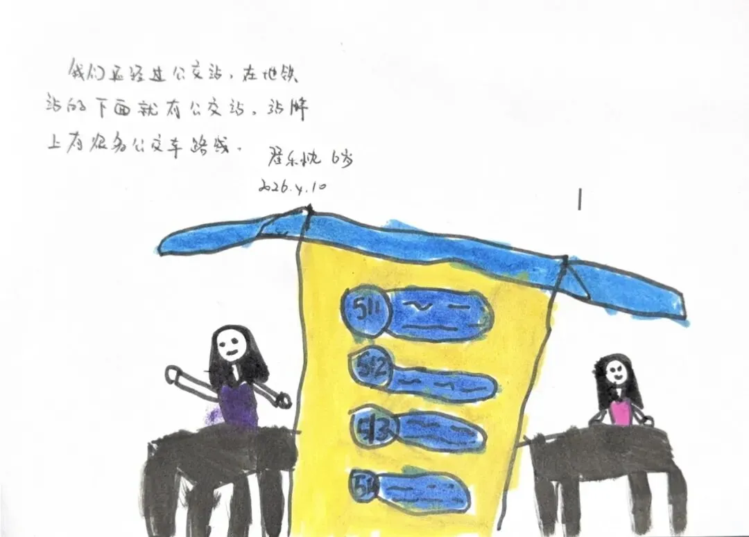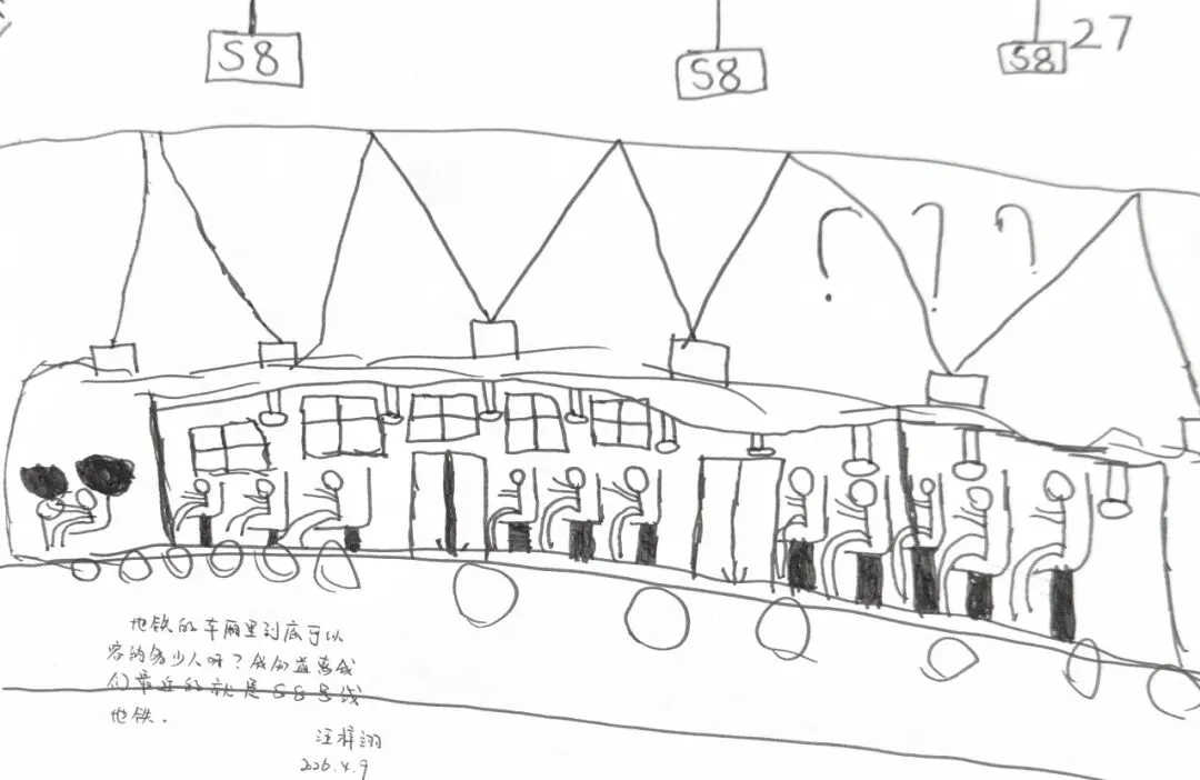 回到教室,孩子们迫不及待地用画笔“写下”自己的见闻。有的画了S8号线的蓝色车身,有的画了公交站台上长长的线路图,还有的画了一排整齐的共享单车。