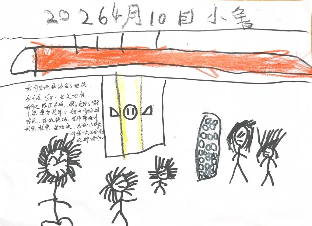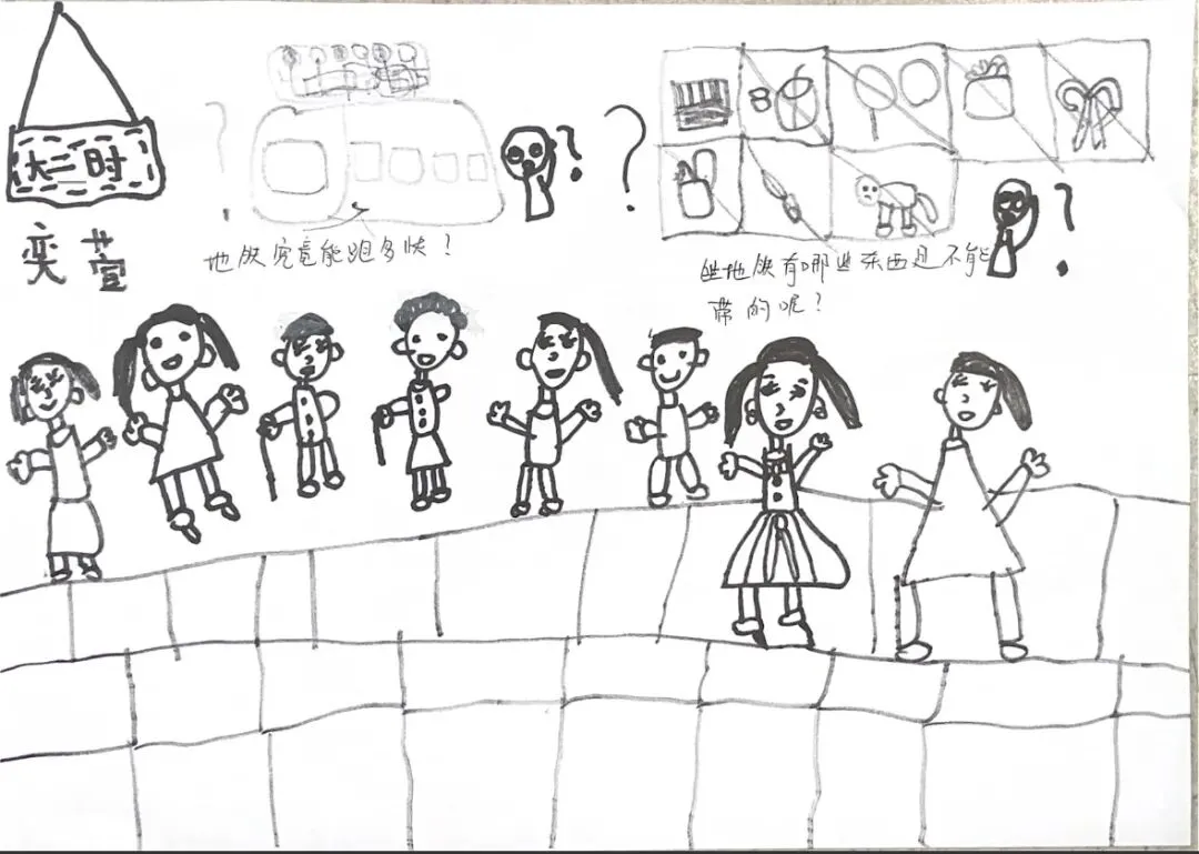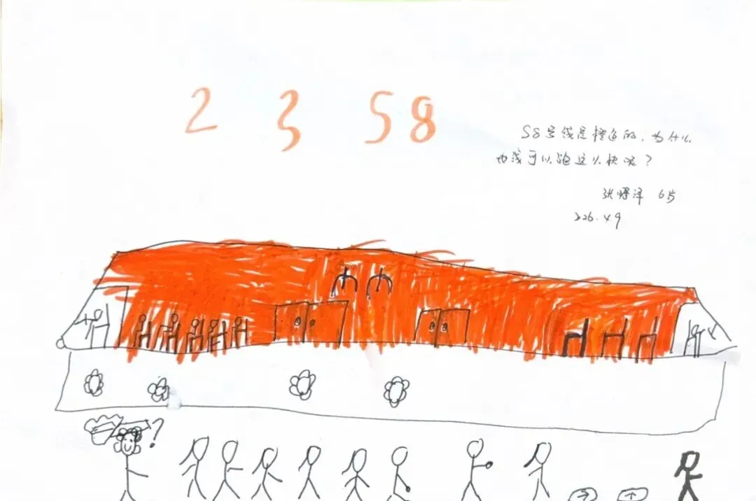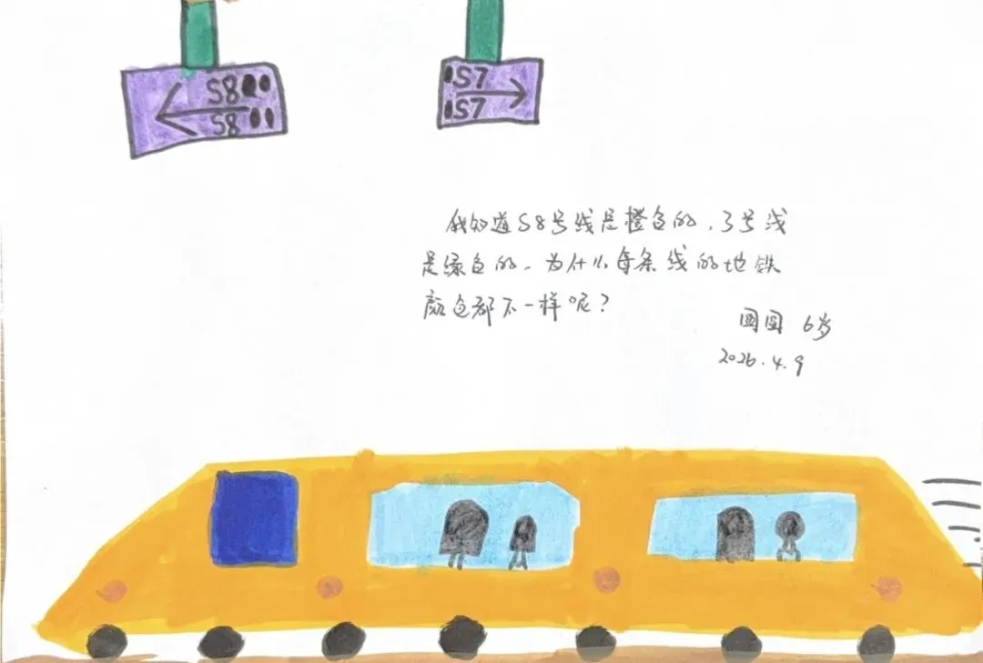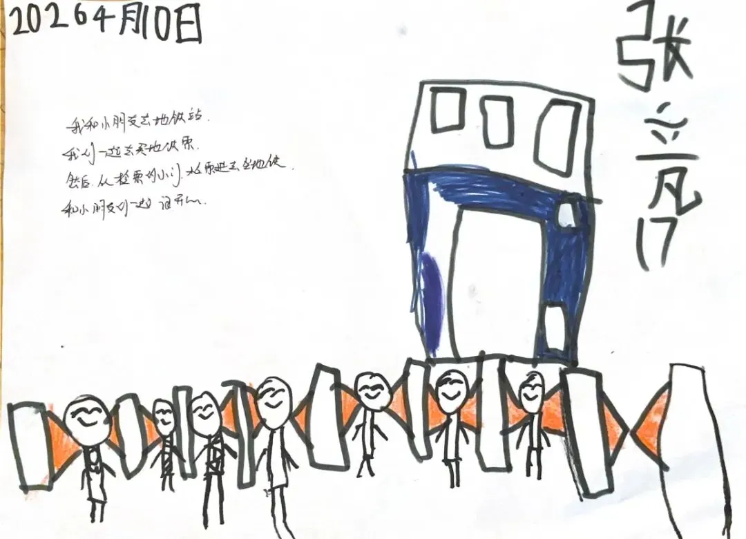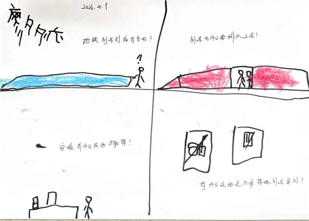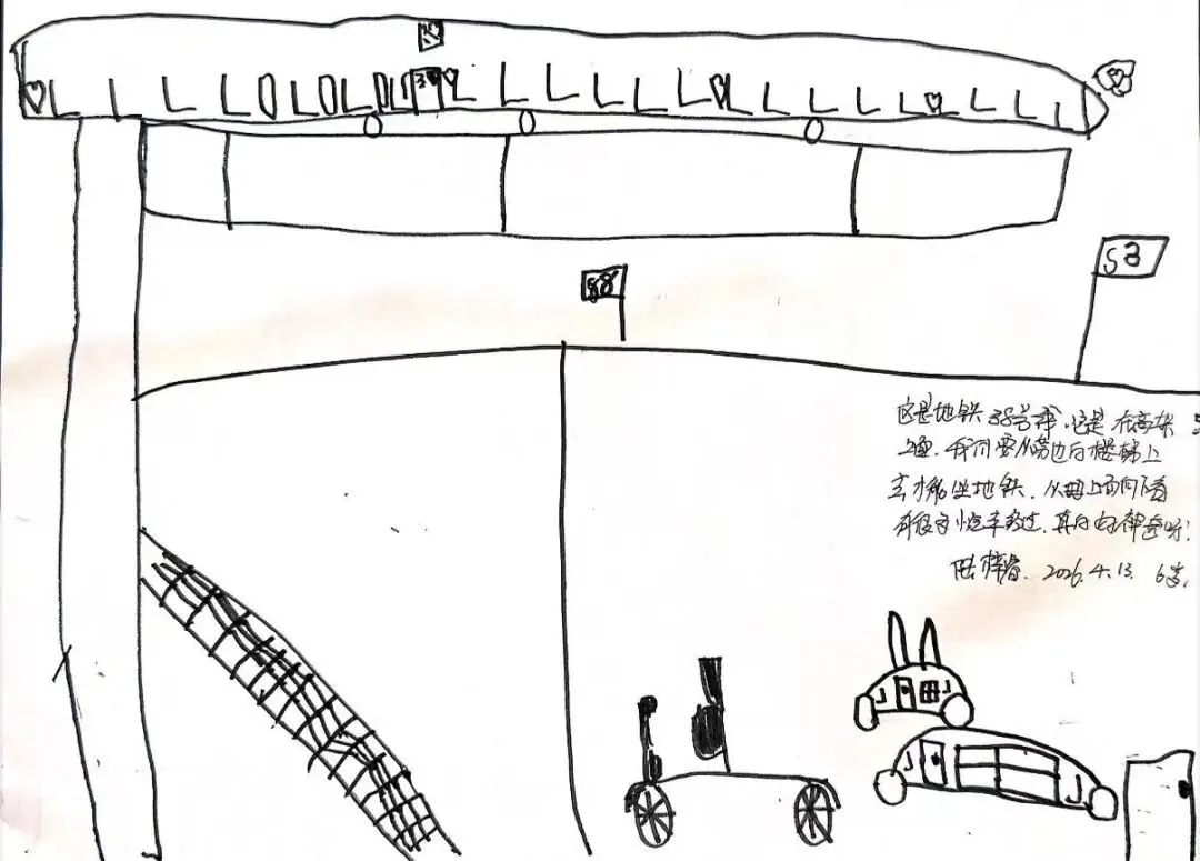 回到教室,孩子们迫不及待地用画笔“写下”自己的见闻。有的画了S8号线的蓝色车身,有的画了公交站台上长长的线路图,还有的画了一排整齐的共享单车。